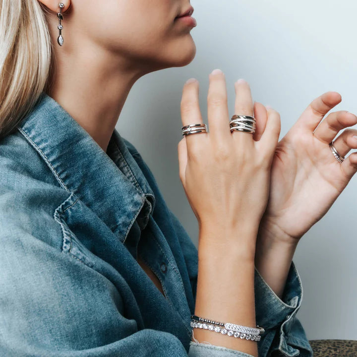 Il rodio conferisce a questo gioiello una maggiore lucentezza e resistenza. L'anello è composto da diverse fasce in argento e zirconi brillanti.