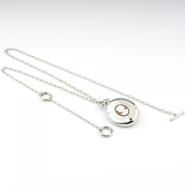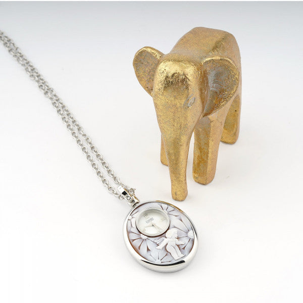 Orologio 'Partenope' in acciaio inossidabile placcato rodio con cameo inciso a mano su conchiglia con putto e fiori.