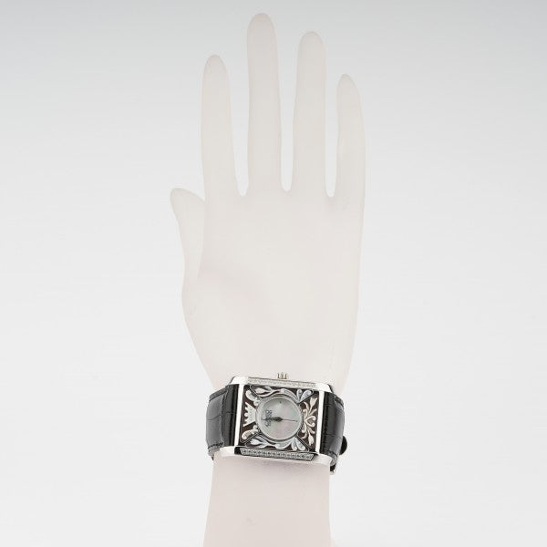 Orologio 'Partenope' in acciaio inossidabile placcato rodio con cameo inciso a mano su conchiglia impreziosito da zirconi bianchi.