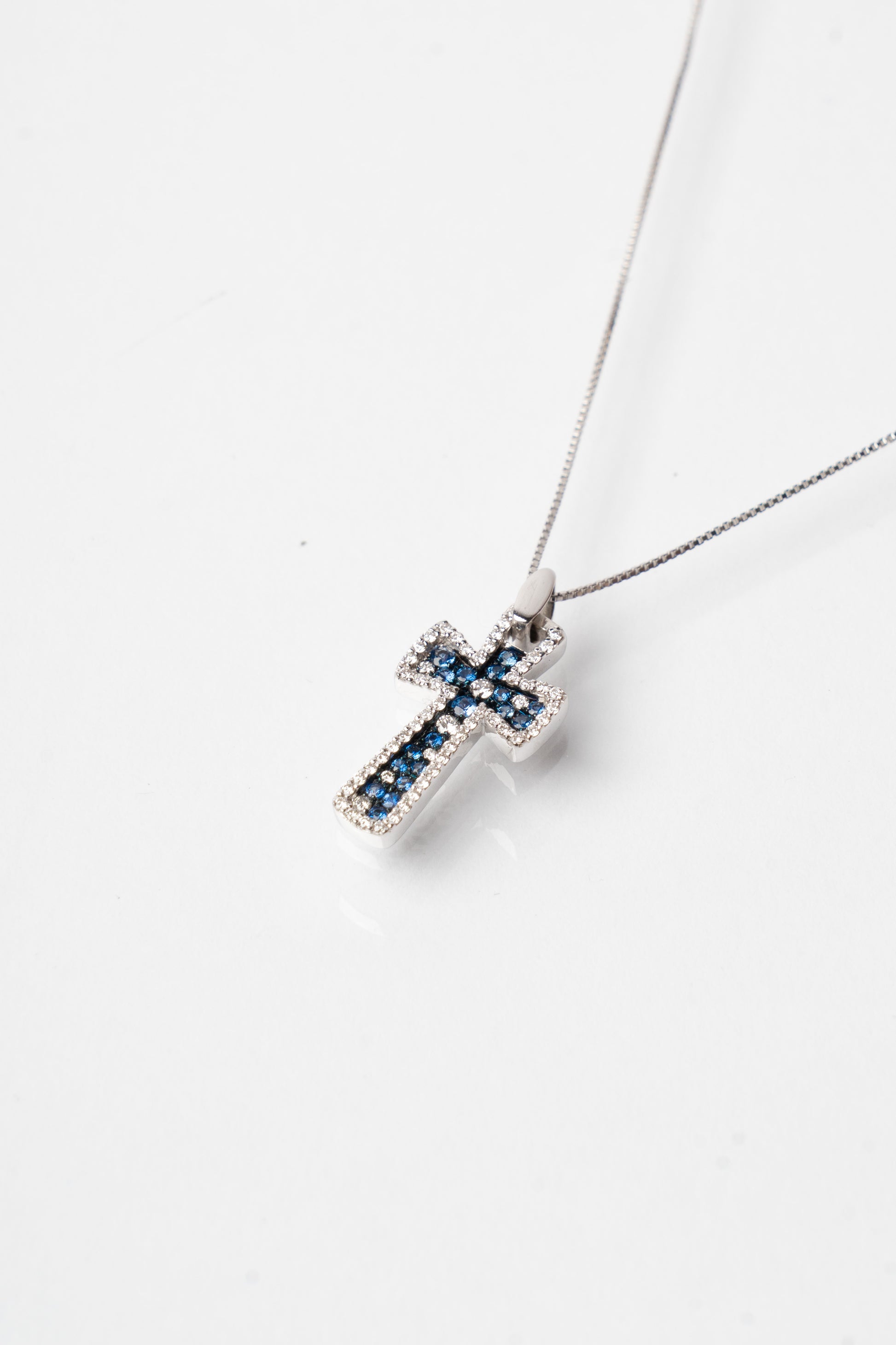 Collana con pendente croce di zaffiri e diamanti taglio brillante e base oro bianco