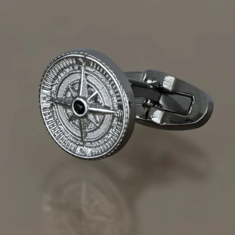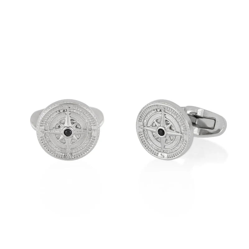 Gemelli per camicia da uomo in acciaio anallergico con rosa dei venti e zircone centrale nero