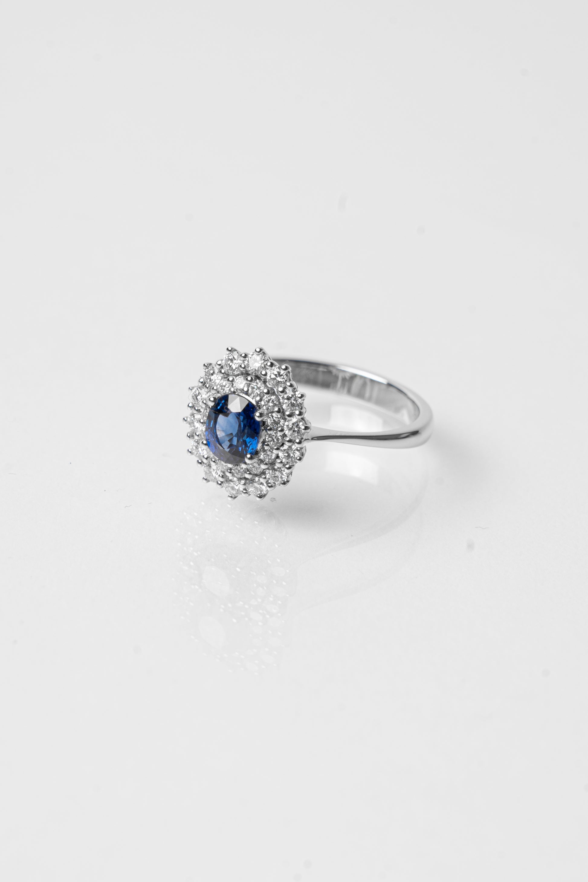 Anello royal ring in oro bianco e diamanti bianchi taglio brillante con centrale in zaffiro blu