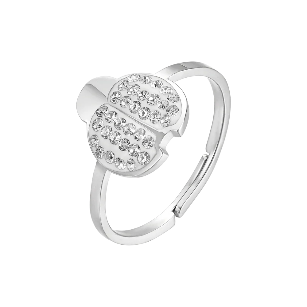 Anello donna in acciaio con coccinella e cristalli bianchi.