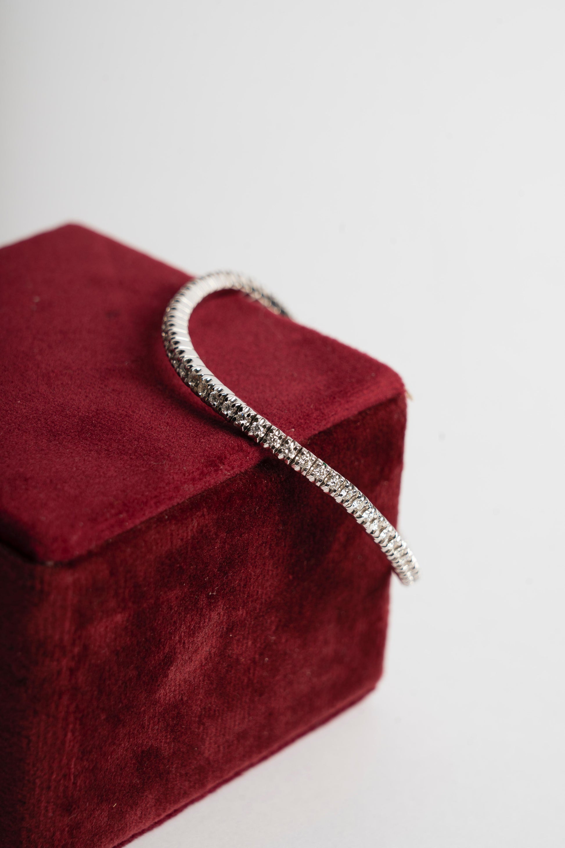 Bracciale Tennis Elastico da uomo in oro bianco incassato con diamanti bianchi taglio brillante. La struttura è composta da una fila ininterrotta di diamanti della stessa misura incastonati su griffes in oro poste una accanto all'altra su una maglia elastica. In questo bracciale si racchiude l'idea del classico gioiello tennis con l'innovazione che lo rende elastico, sicuro e facile da indossare.