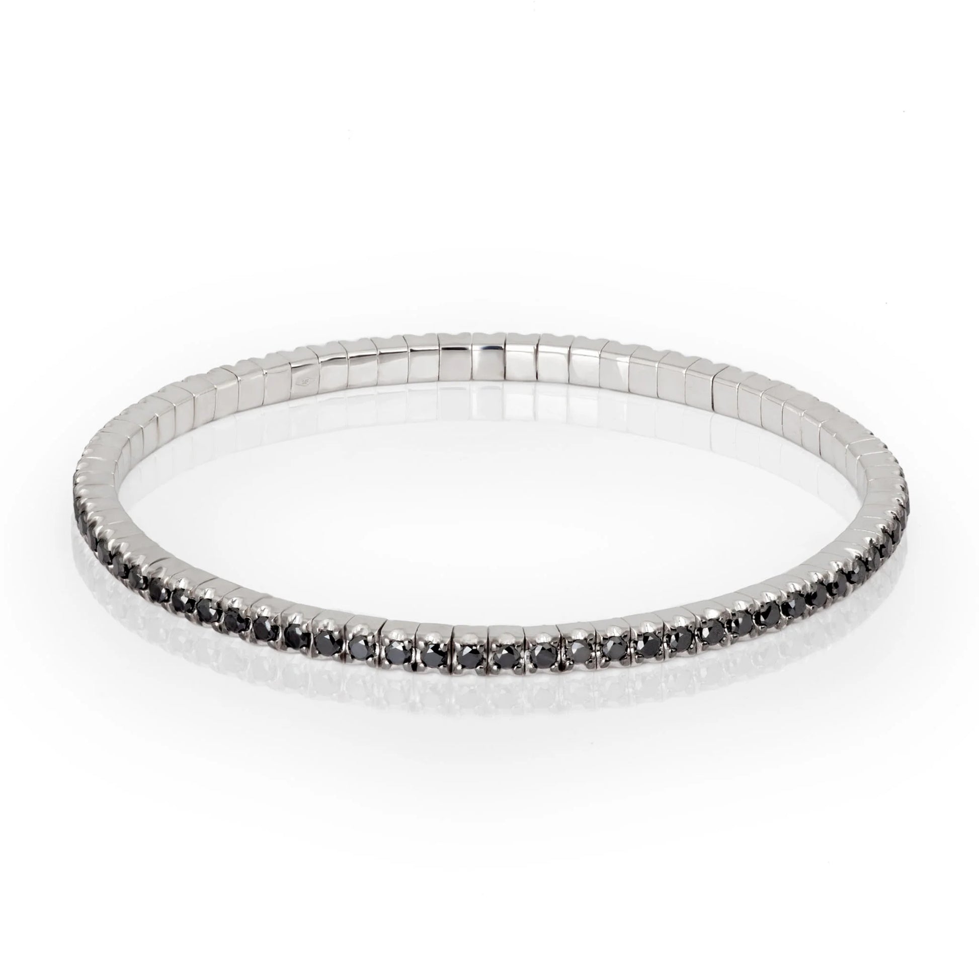 Bracciale Tennis Elastico da uomo in oro bianco incassato con diamanti black da 3 punti. La struttura è composta da una fila ininterrotta di diamanti della stessa misura incastonati su griffes in oro poste una accanto all'altra su una maglia elastica. In questo bracciale si racchiude l'idea del classico gioiello tennis con l'innovazione che lo rende elastico, sicuro e facile da indossare.