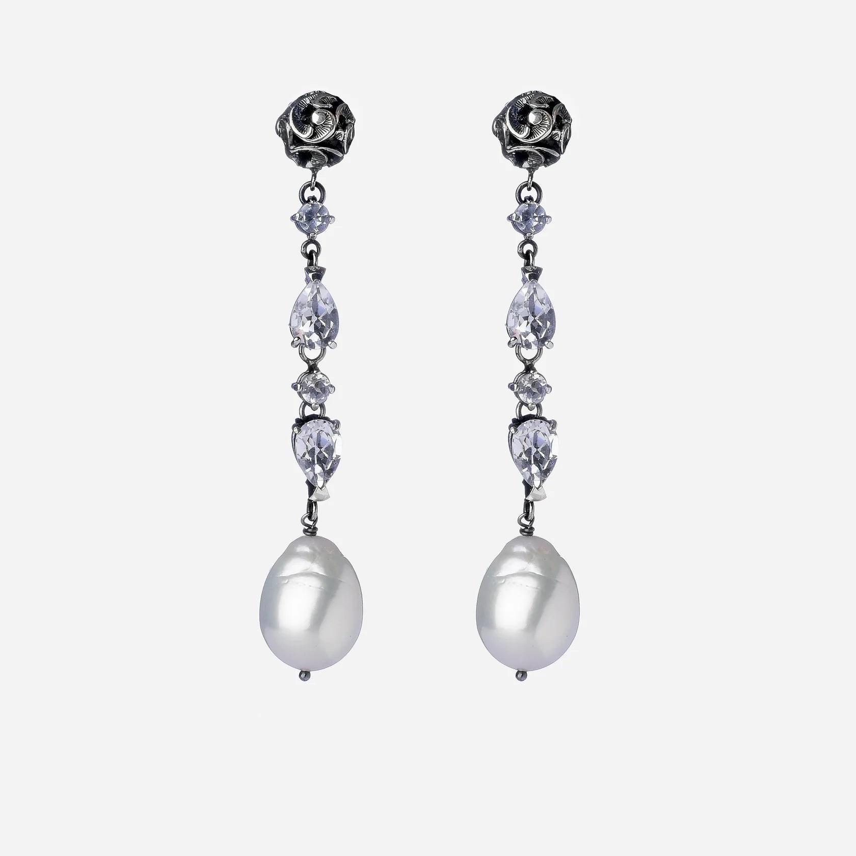 Orecchino con pallina a lobo in argento brunito inciso a mano con l’antica tecnica del bulino. Le pietre naturali e la perla grande finale rappresentano la femminilità e la purezza di un accessorio che non può mancare nel tuo porta gioie.