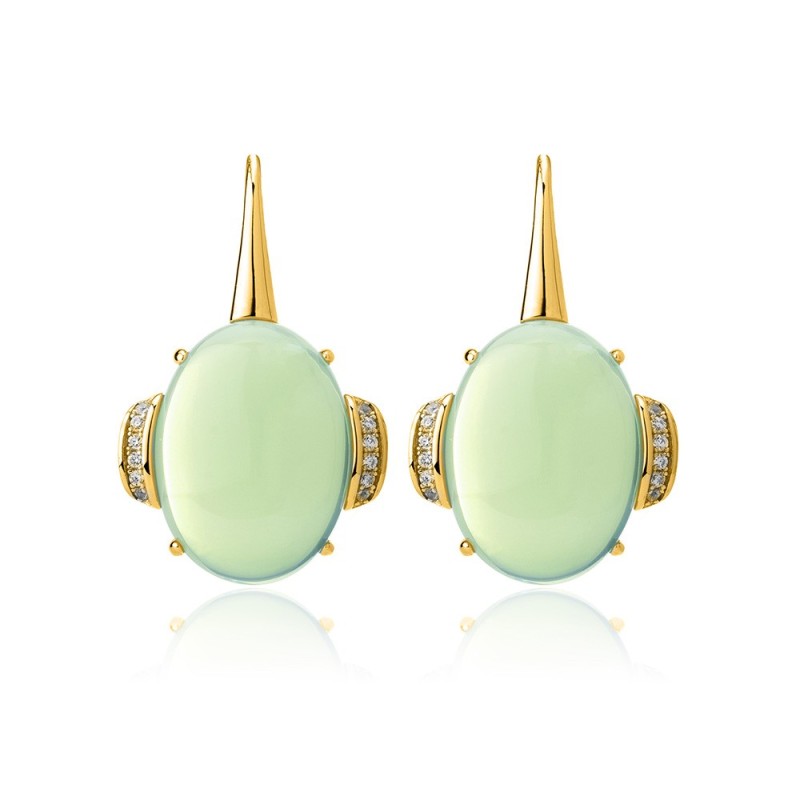 Orecchini realizzati in Argento 925 con pietra cabochon verde e dettagli di luminosi zirconi bianchi.