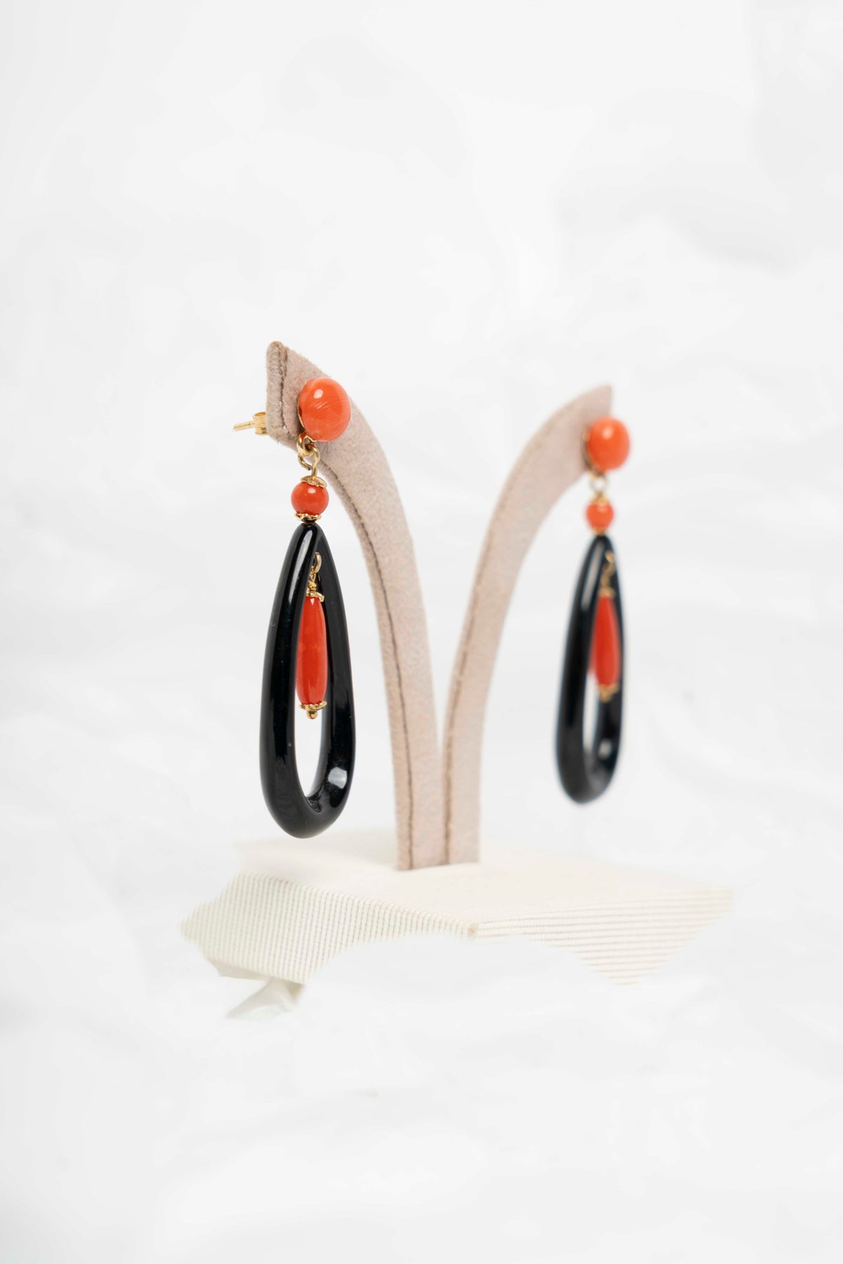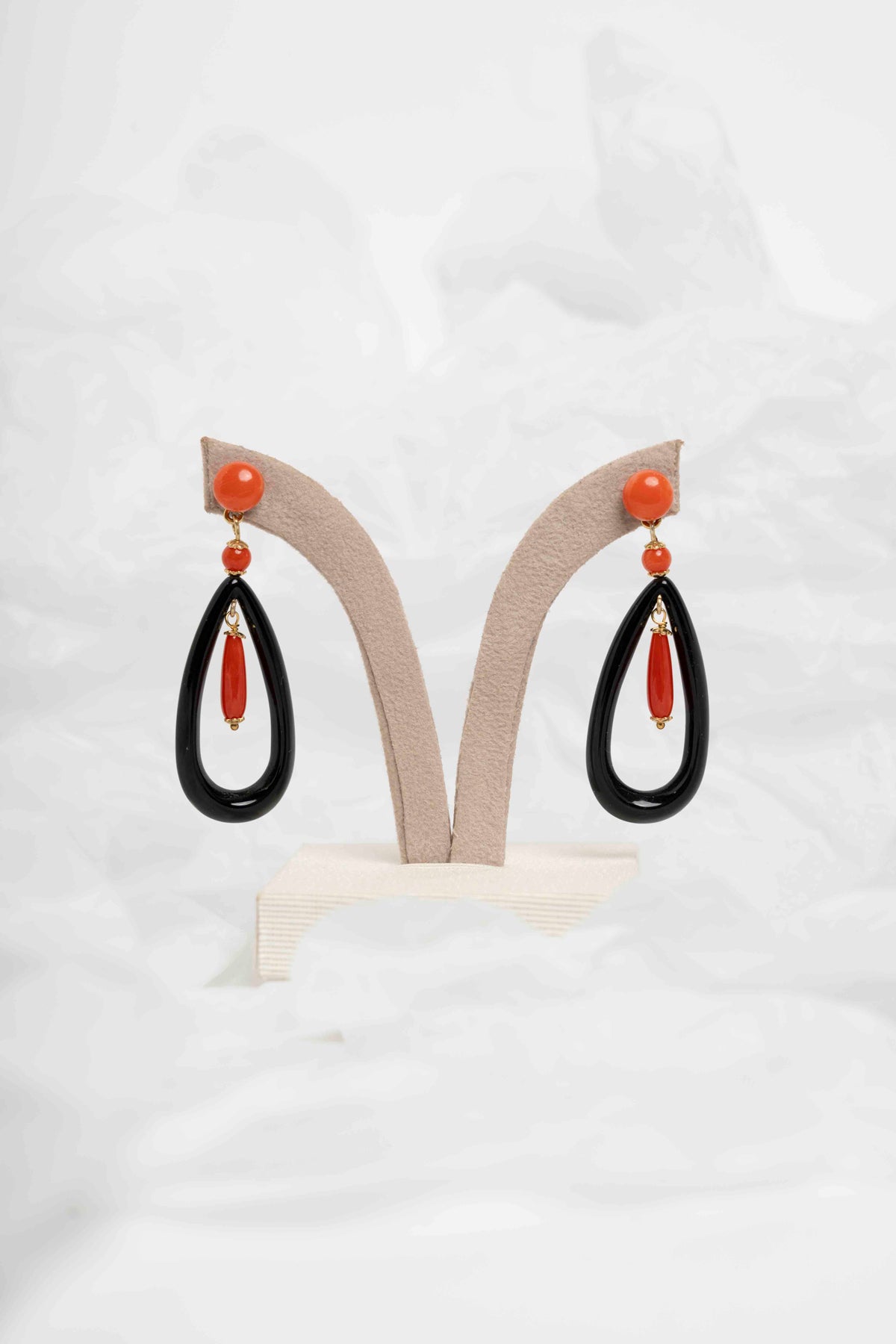 Orecchini pendenti con una sfera piccola in corallo mediterraneo sul perno e gocce in onice e corallo.