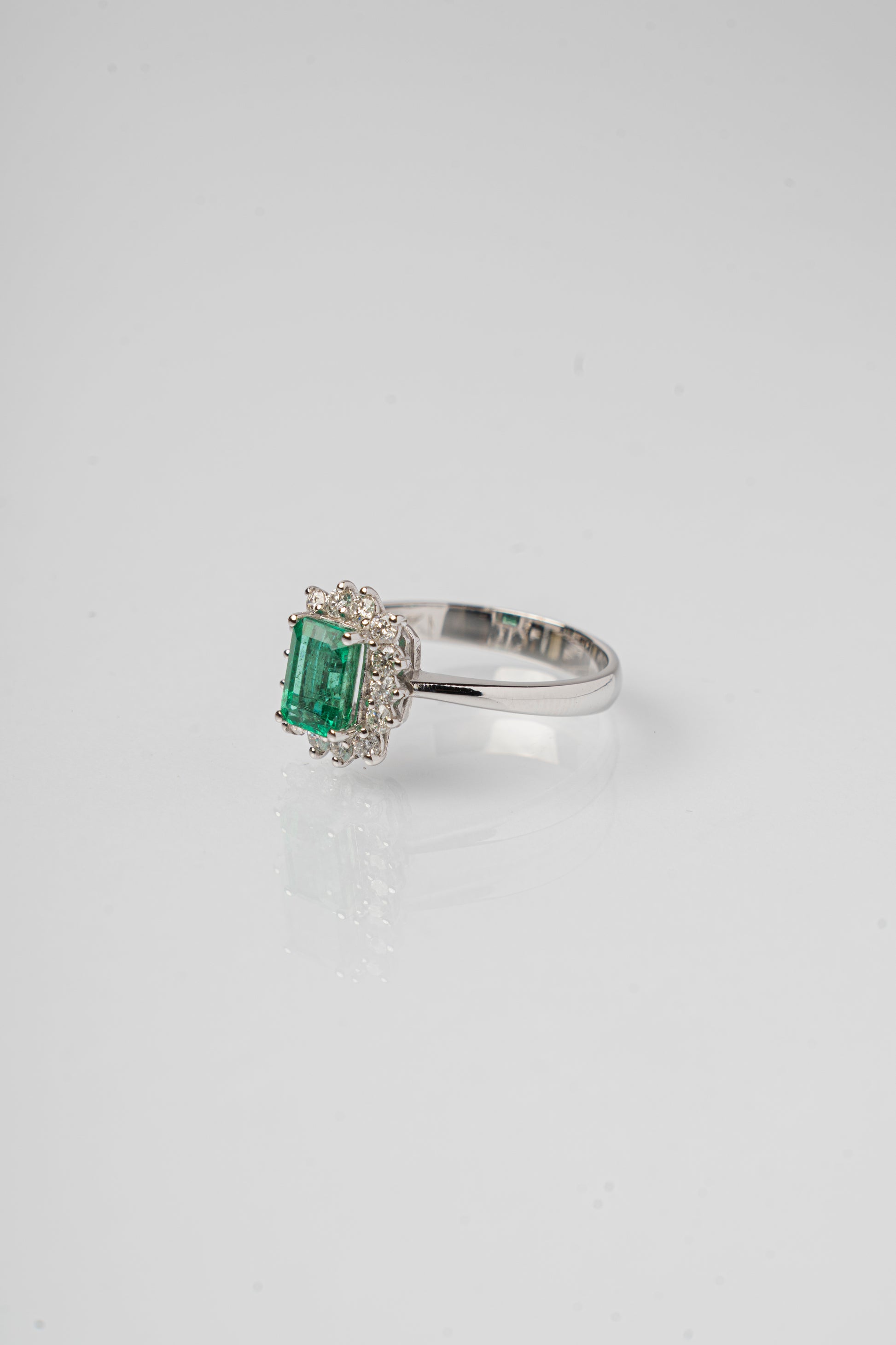 Anello con smeraldo centrale taglio smeraldo e contorno di diamanti base oro giallo
