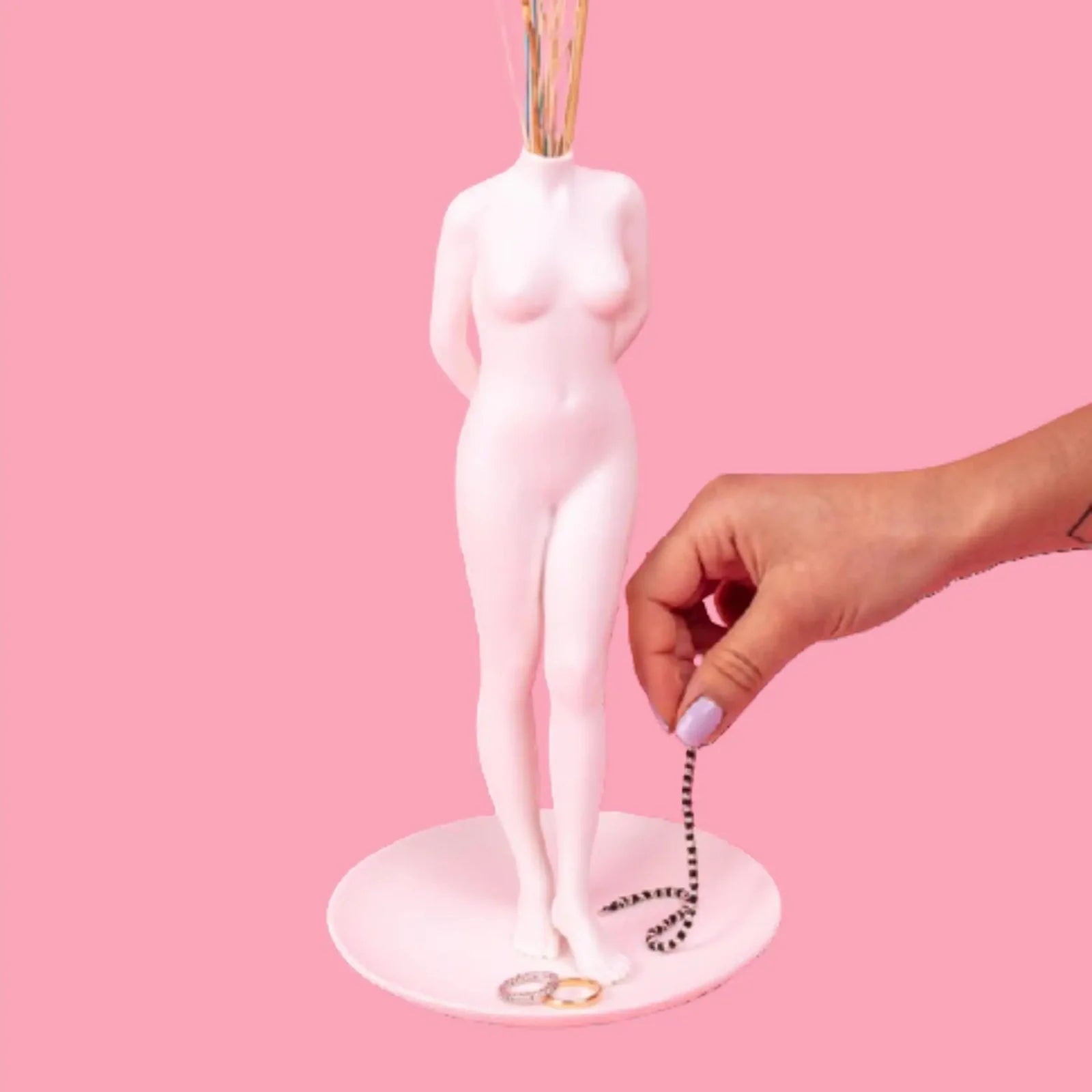 La Timida traduce l’iconica illustrazione della flower woman dell’artista in una forma tridimensionale: un vaso che ricorda una figura modesta e un vassoio poco profondo che raccoglie chiavi e piccoli oggetti.