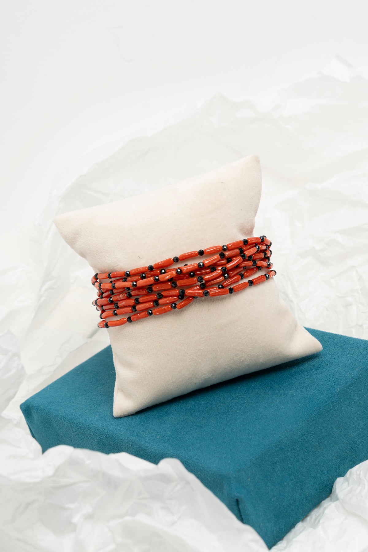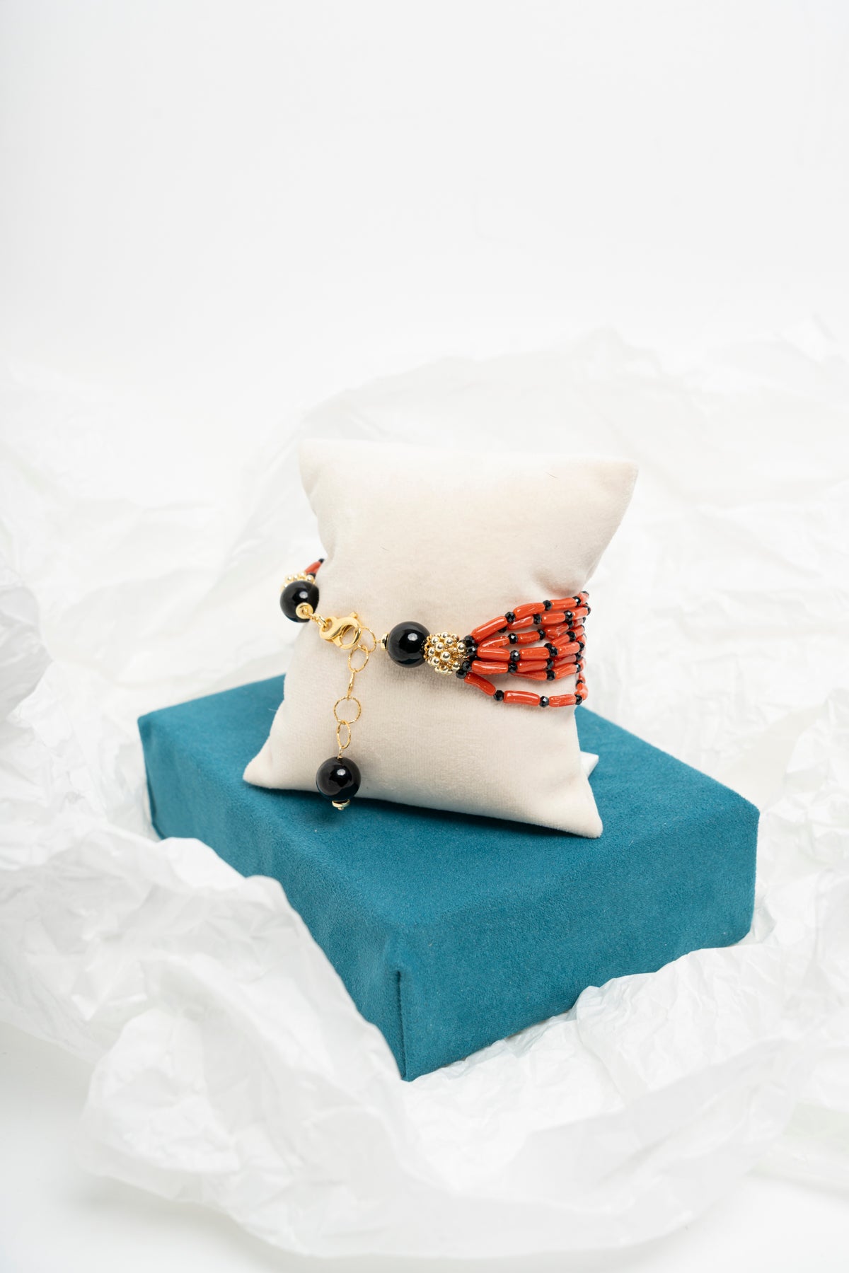 Bracciale multifili in onice nero e corallo mediterraneo e dettagli in argento placcato oro
