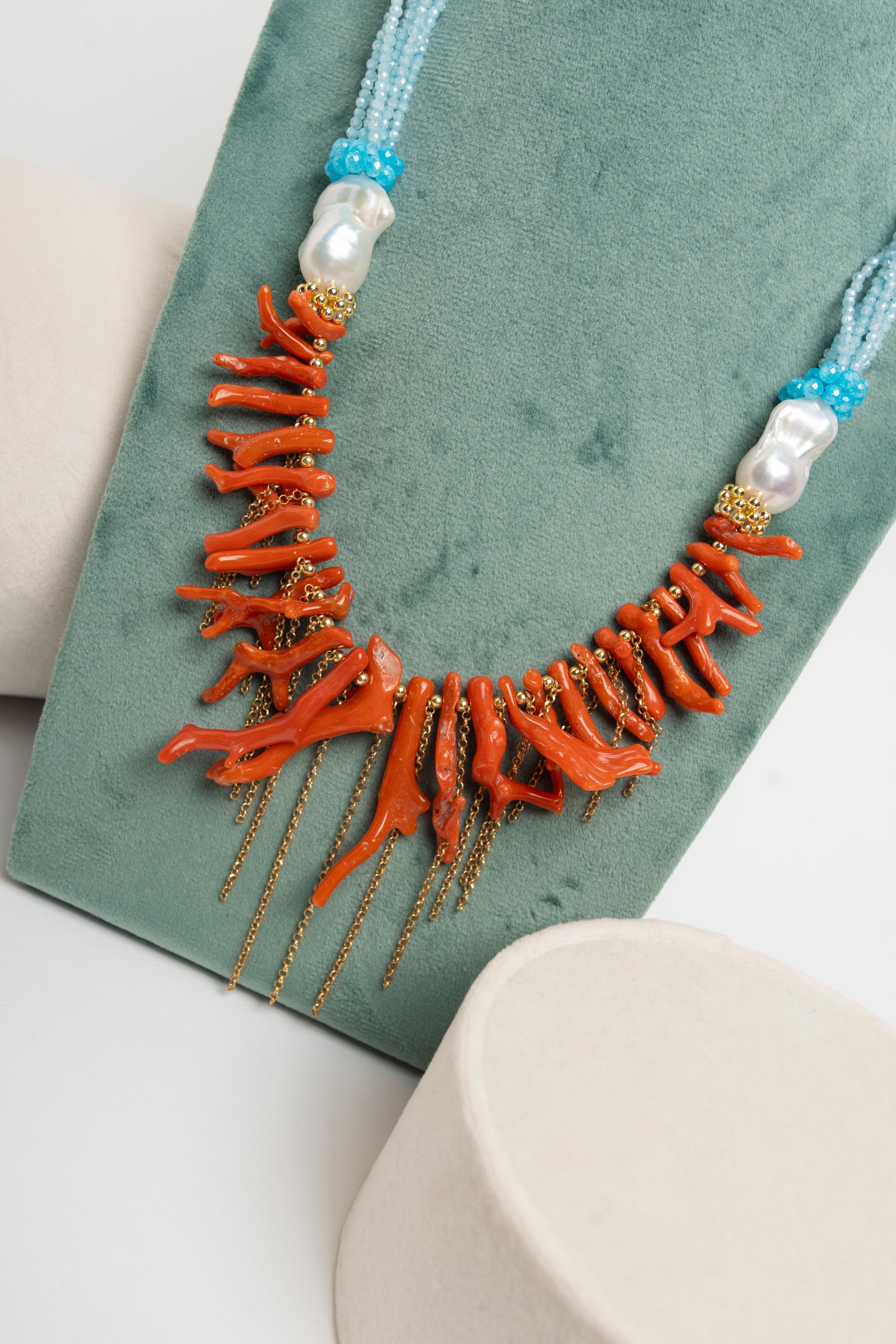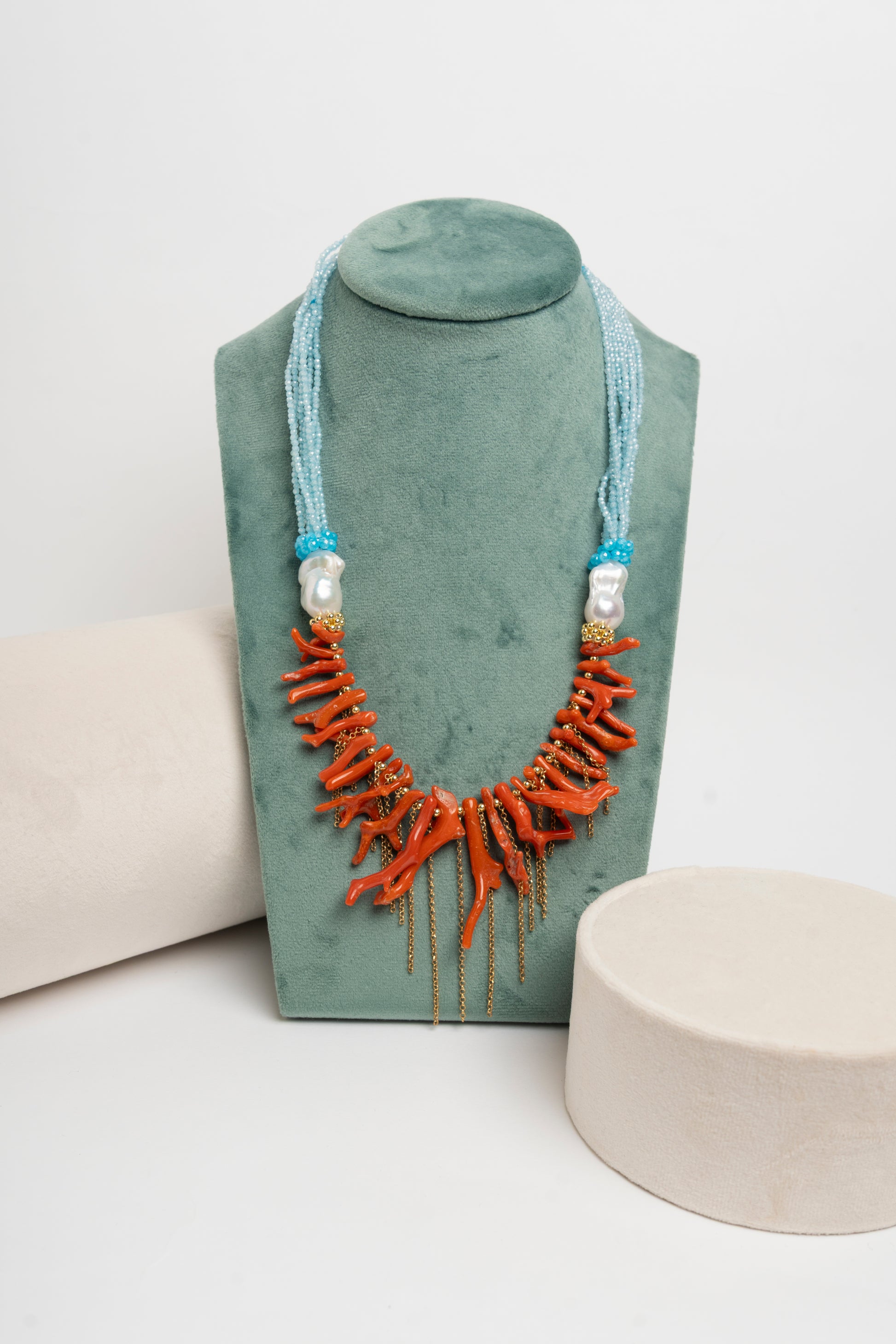Collana in corallo mediterraneo, perla scaramazza e multifili di zirconi piccoli azzurri.
