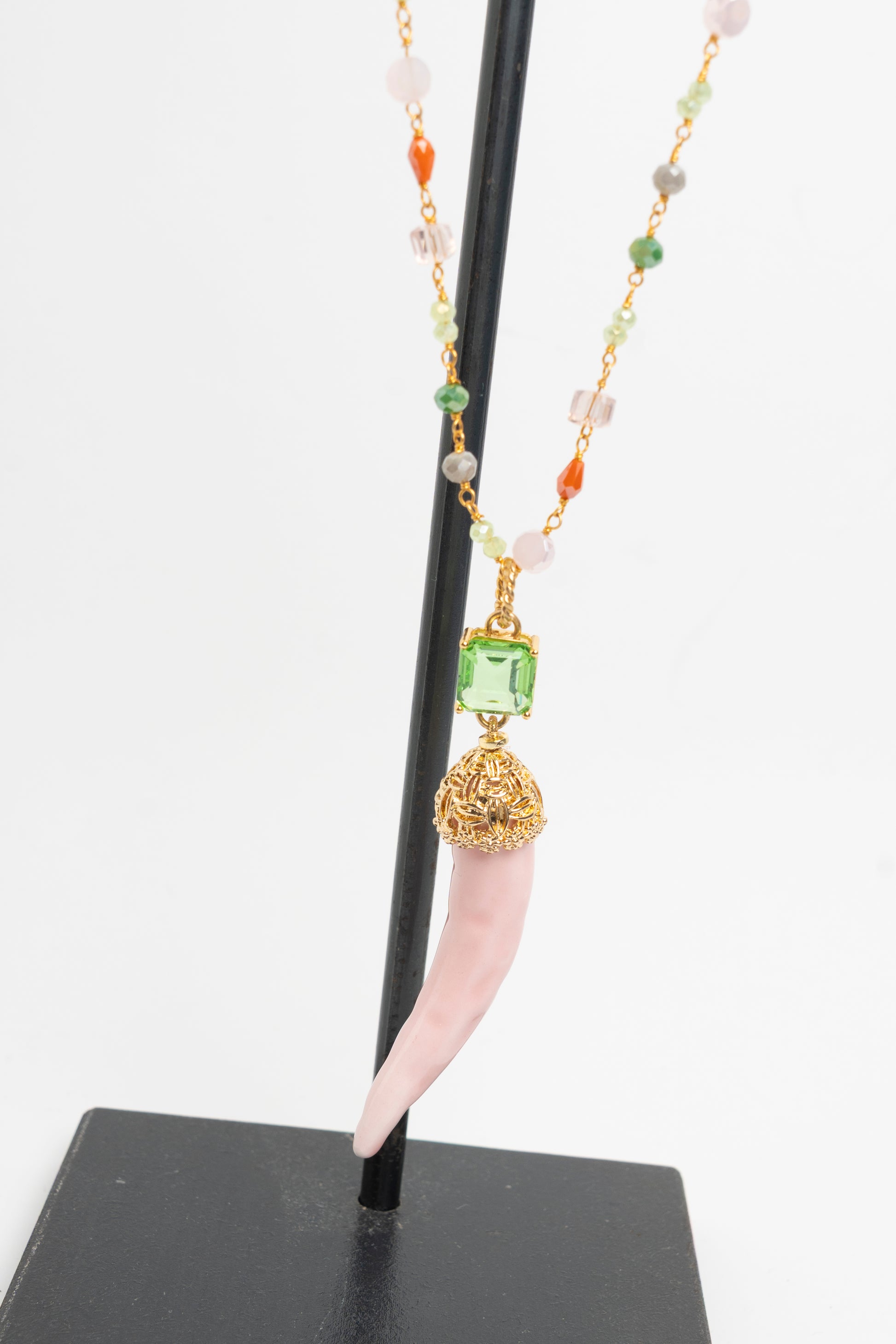 Collana con pendente centrale a forma di corno cipria in ceramica, cristallo centrale verde e catena con corallini multicolor arancione, rosa e verdi.