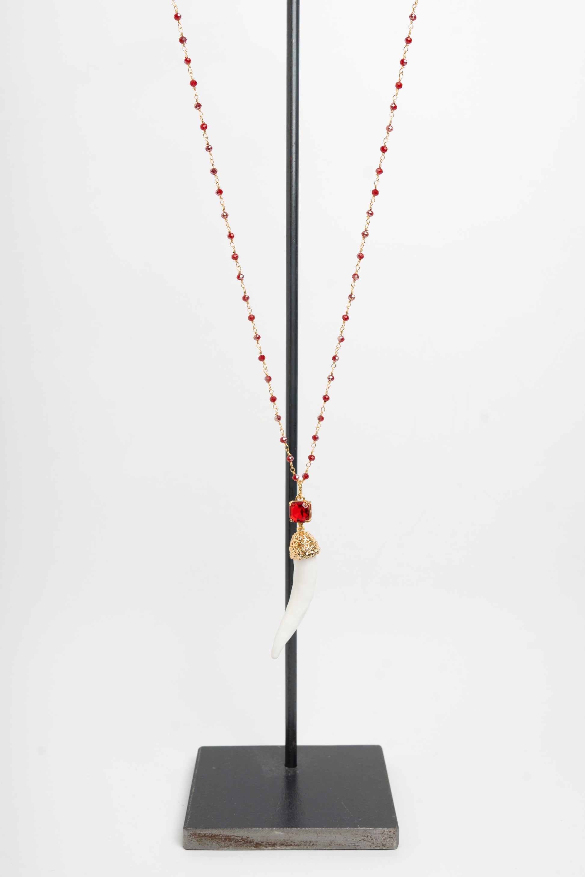 Collana con pendente centrale a forma di corno bianco in ceramica, cristallo centrale rosso e catena con corallini rossi