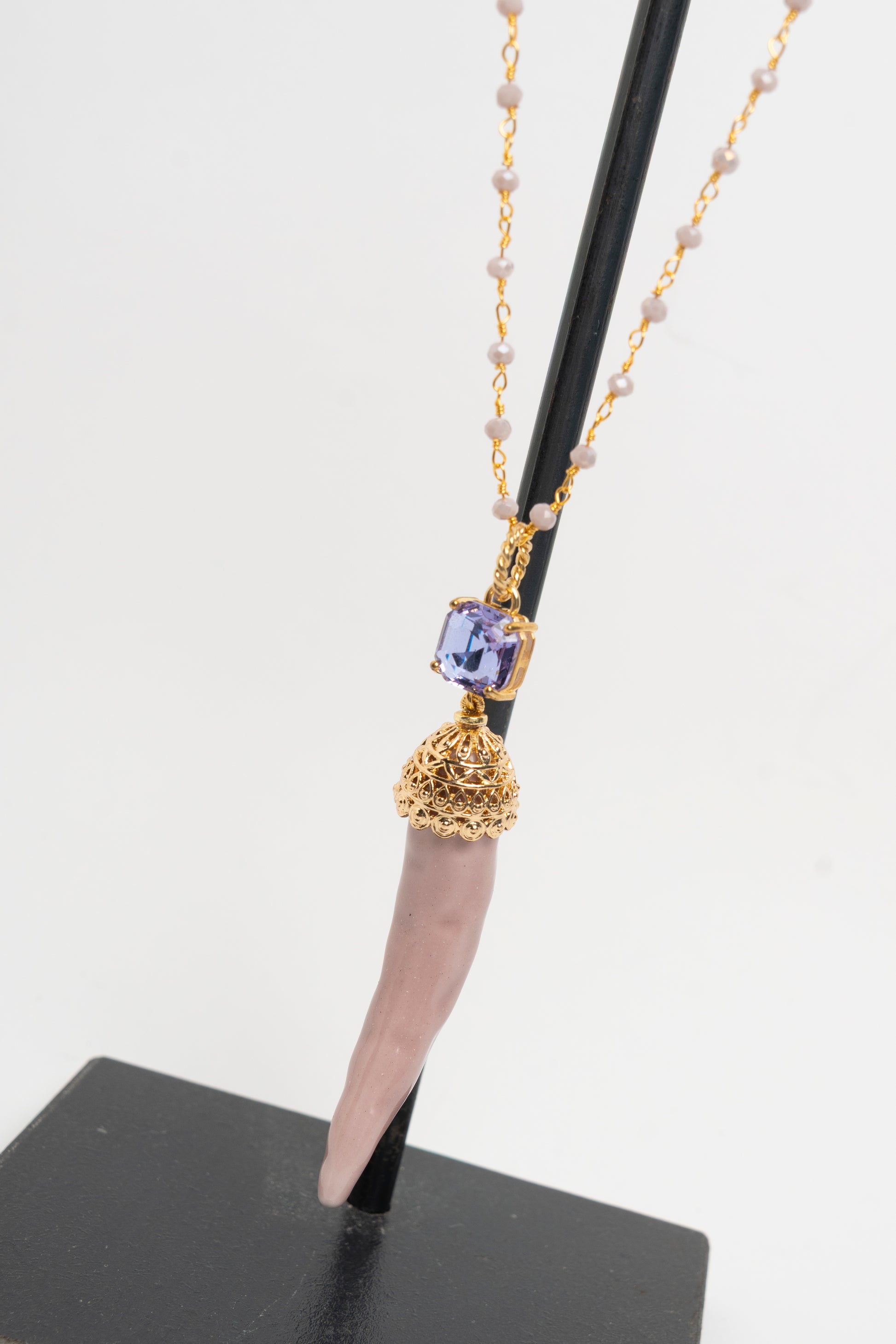 Collana con pendente centrale a forma di corno cipria in ceramica, cristallo centrale lilla e catena con corallini cipria
