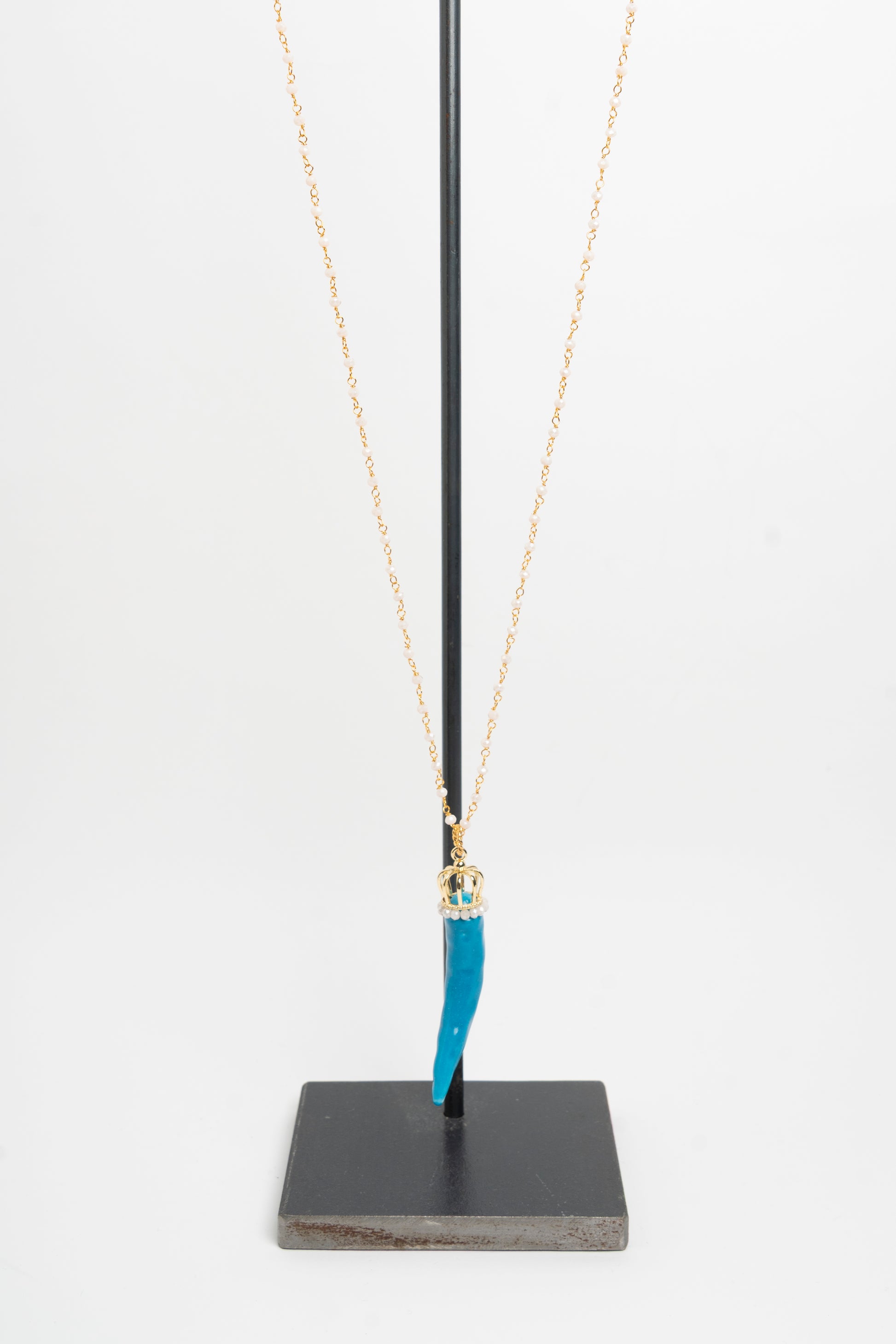Collana con pendente centrale a forma di corno turchese in ceramica, corona in argento centrale e catena con corallini bianchi