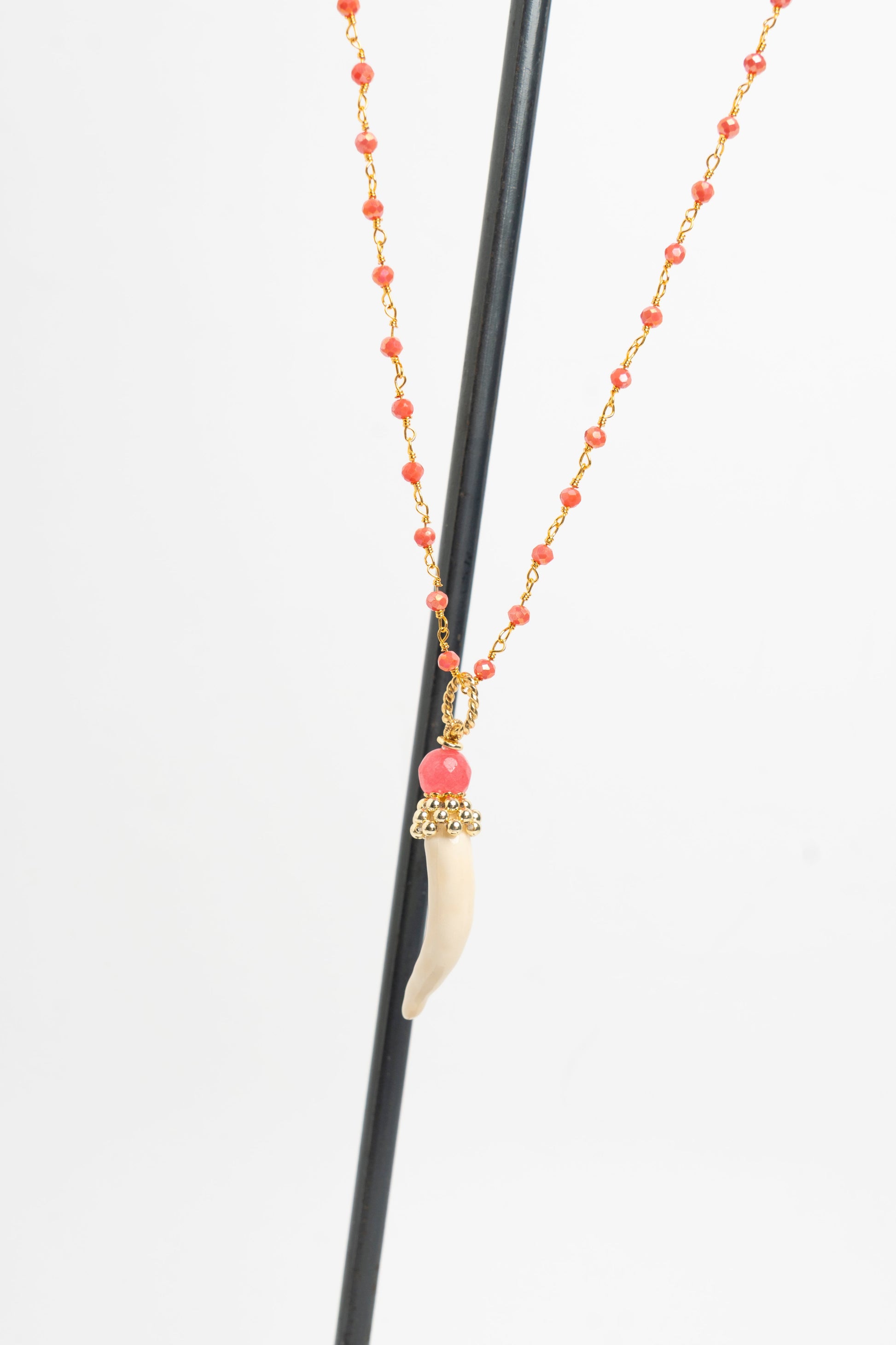 Collana con pendente centrale a forma di corno piccolo beige in ceramica, sfera con pietra naturale fucsia e catena con corallini fucsia