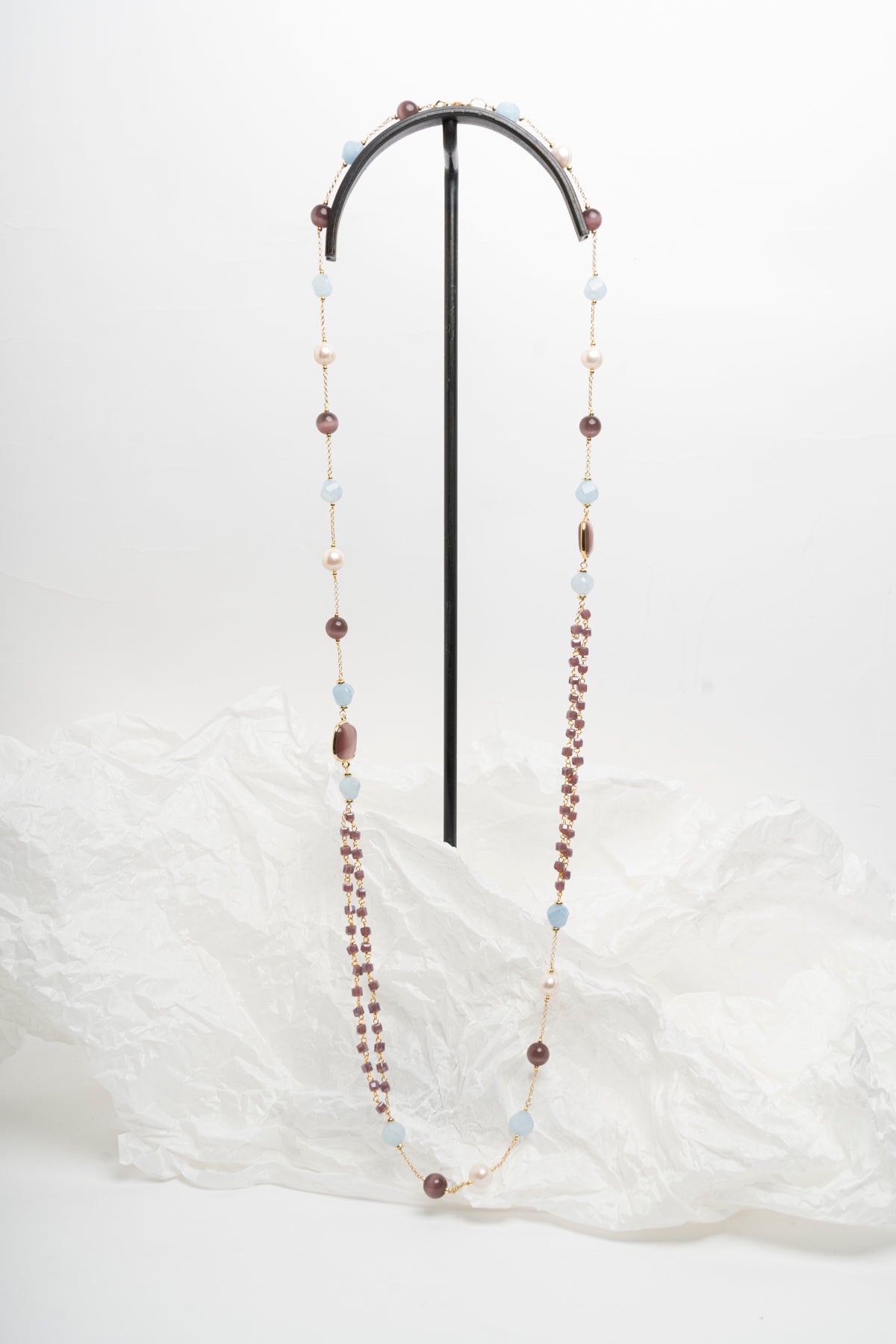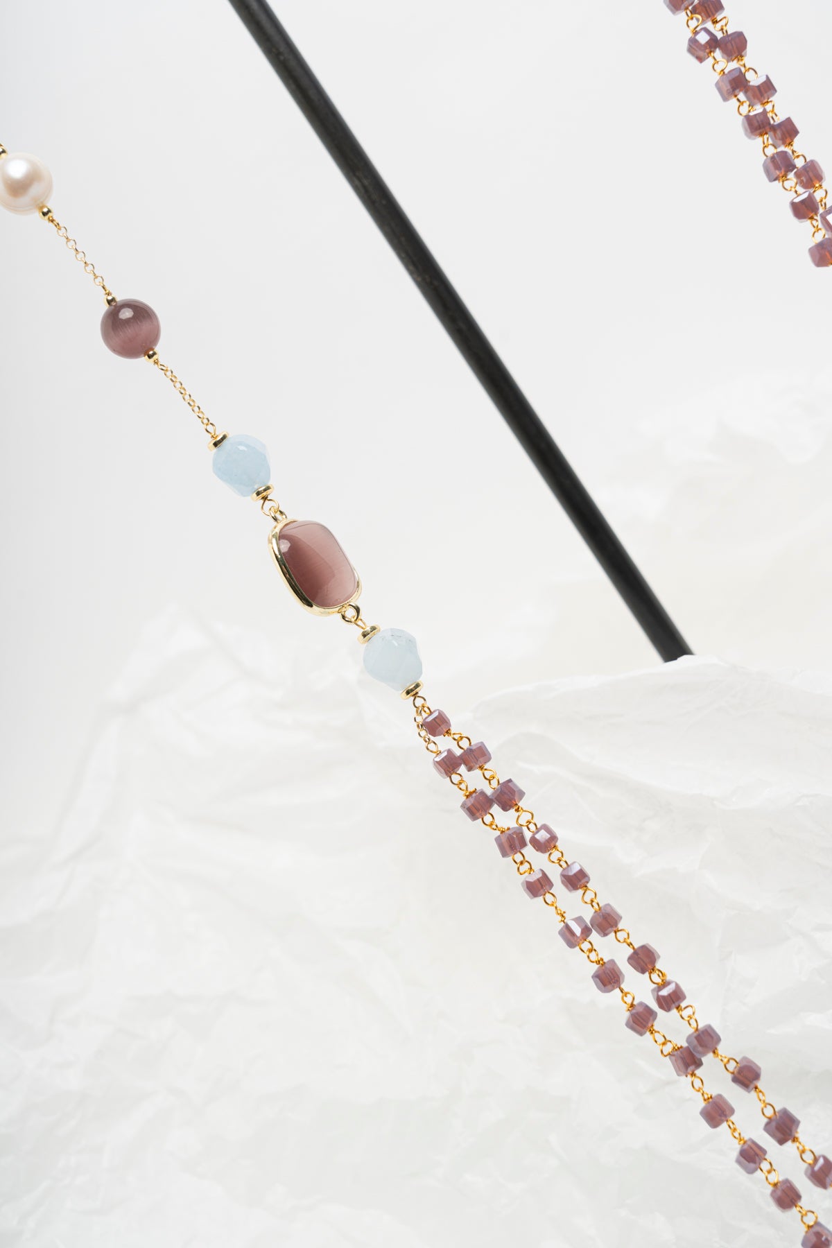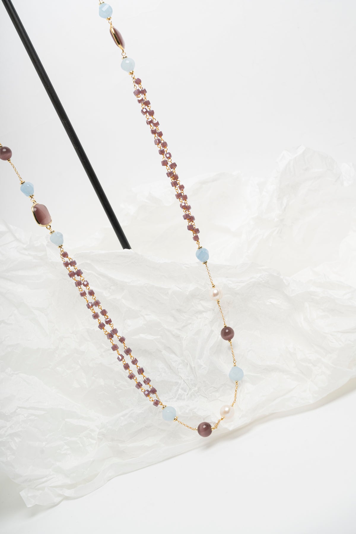 Collana lunga modello Chanel con perle, giada e zirconi azzurro polvere e moka