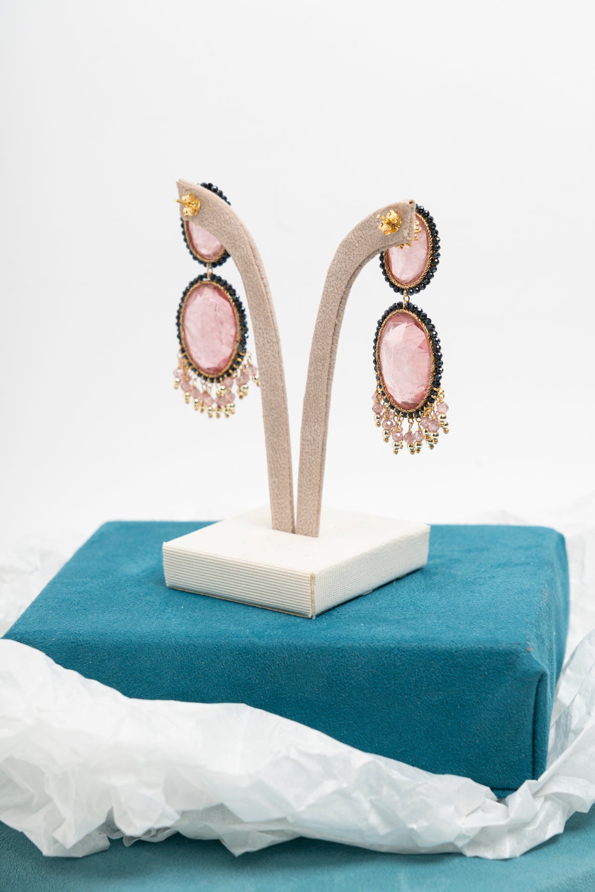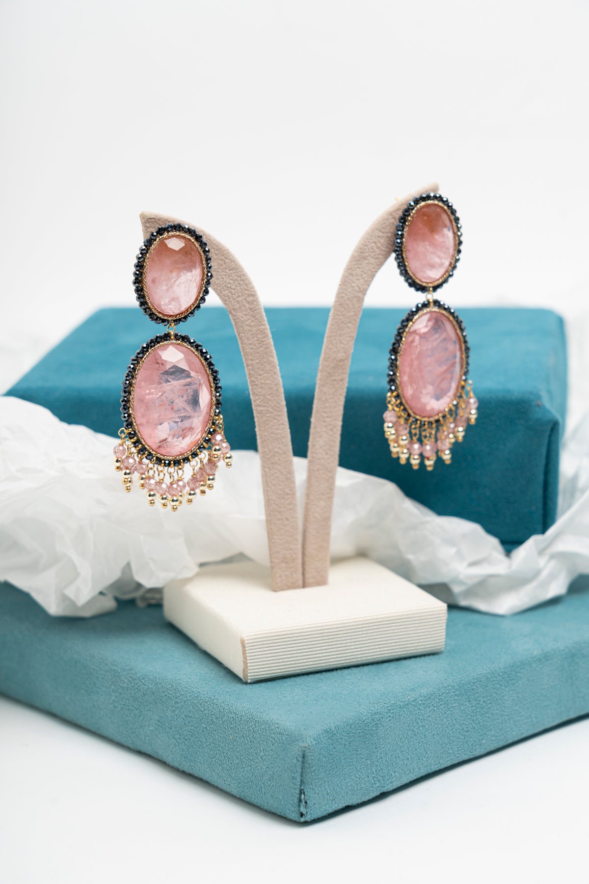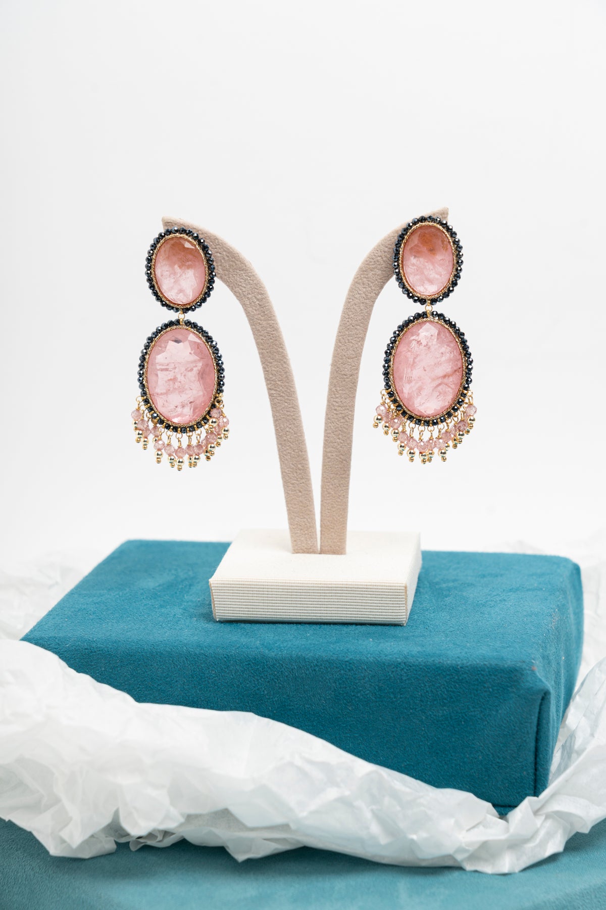 Orecchini pendenti con zirconi rosa ovali e micro cristalli neri