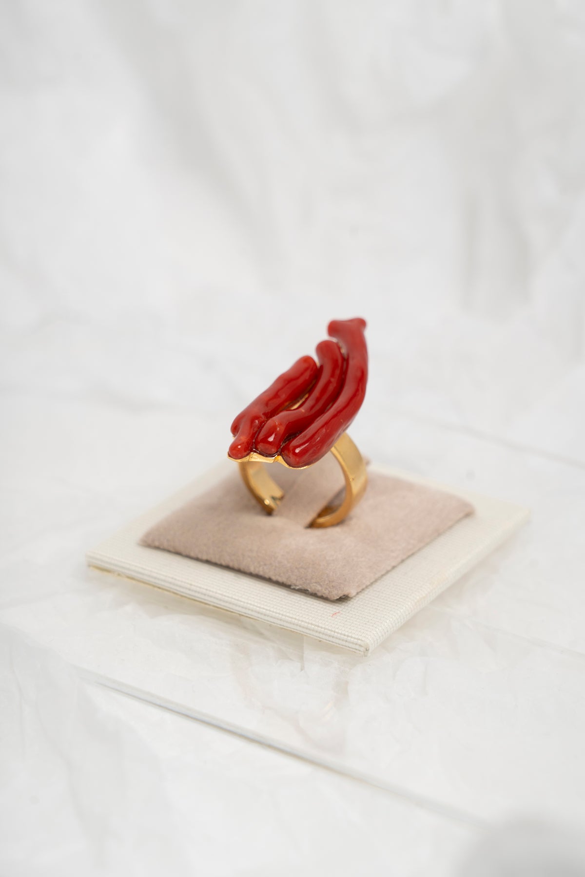 Anello in argento placcato oro 18 kt con ramo in corallo mediterraneo