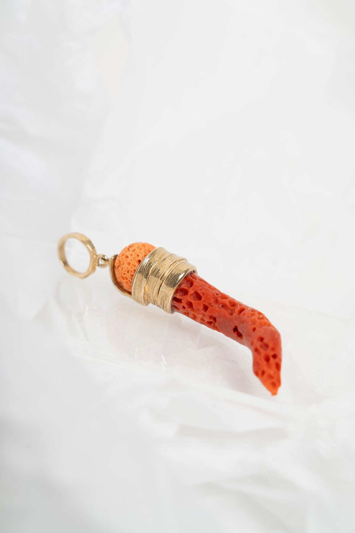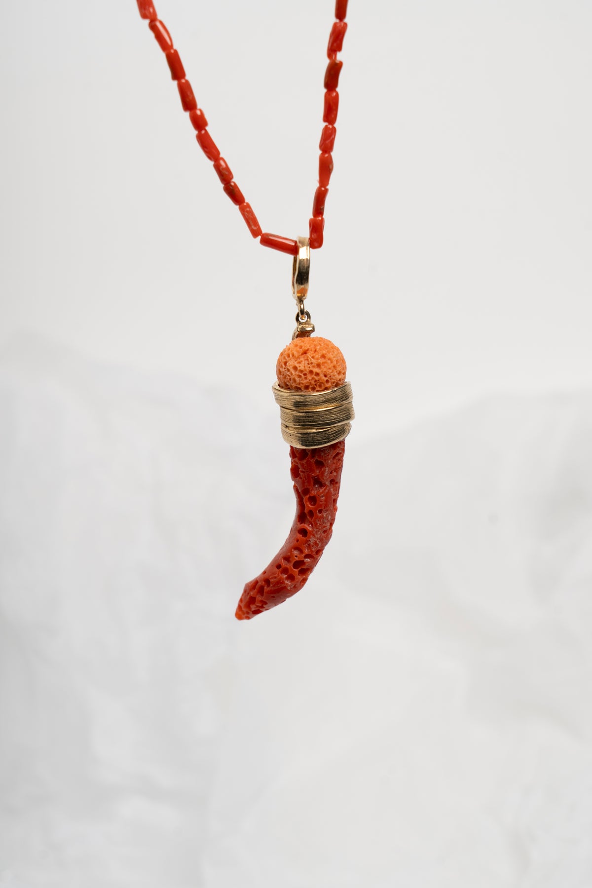 Ciondolo a forma di corno con contromaglia in argento placcato oro 18kt e corallo mediterraneo grezzo rosso e rosa