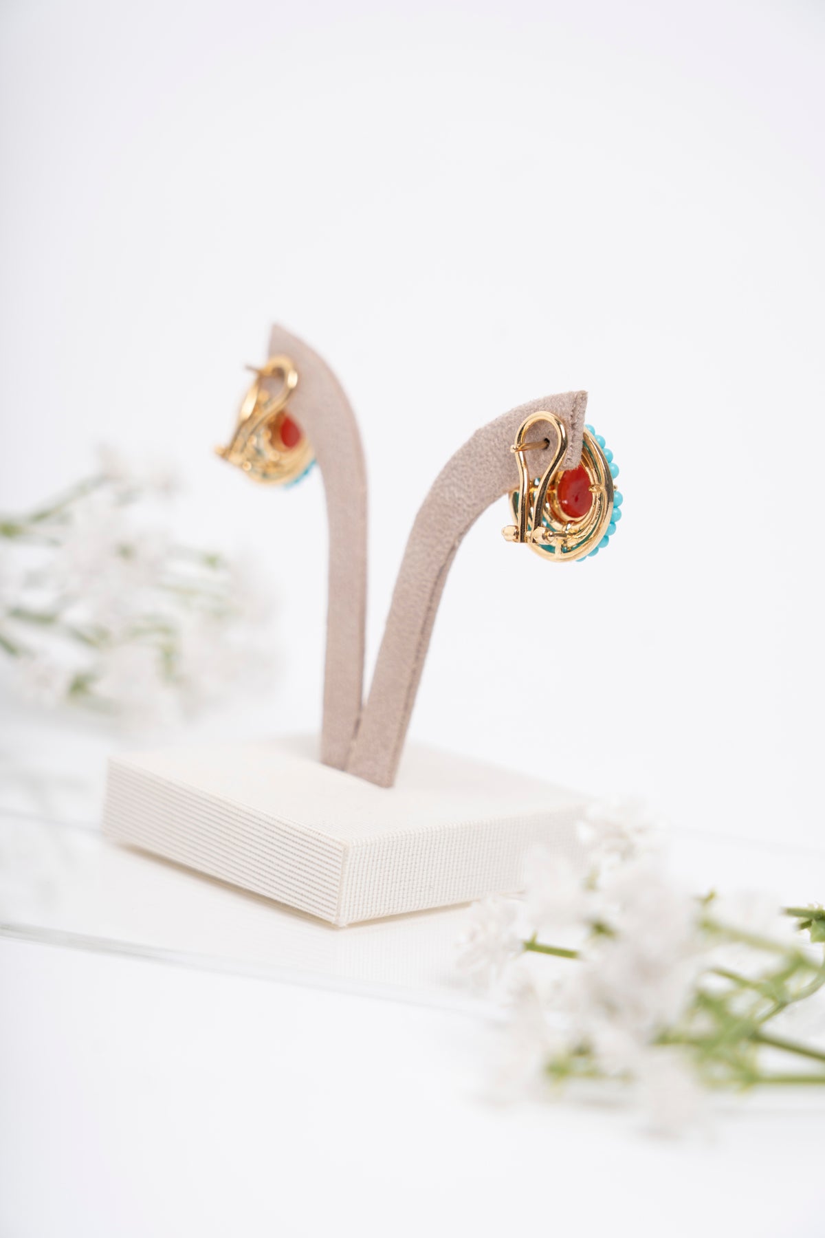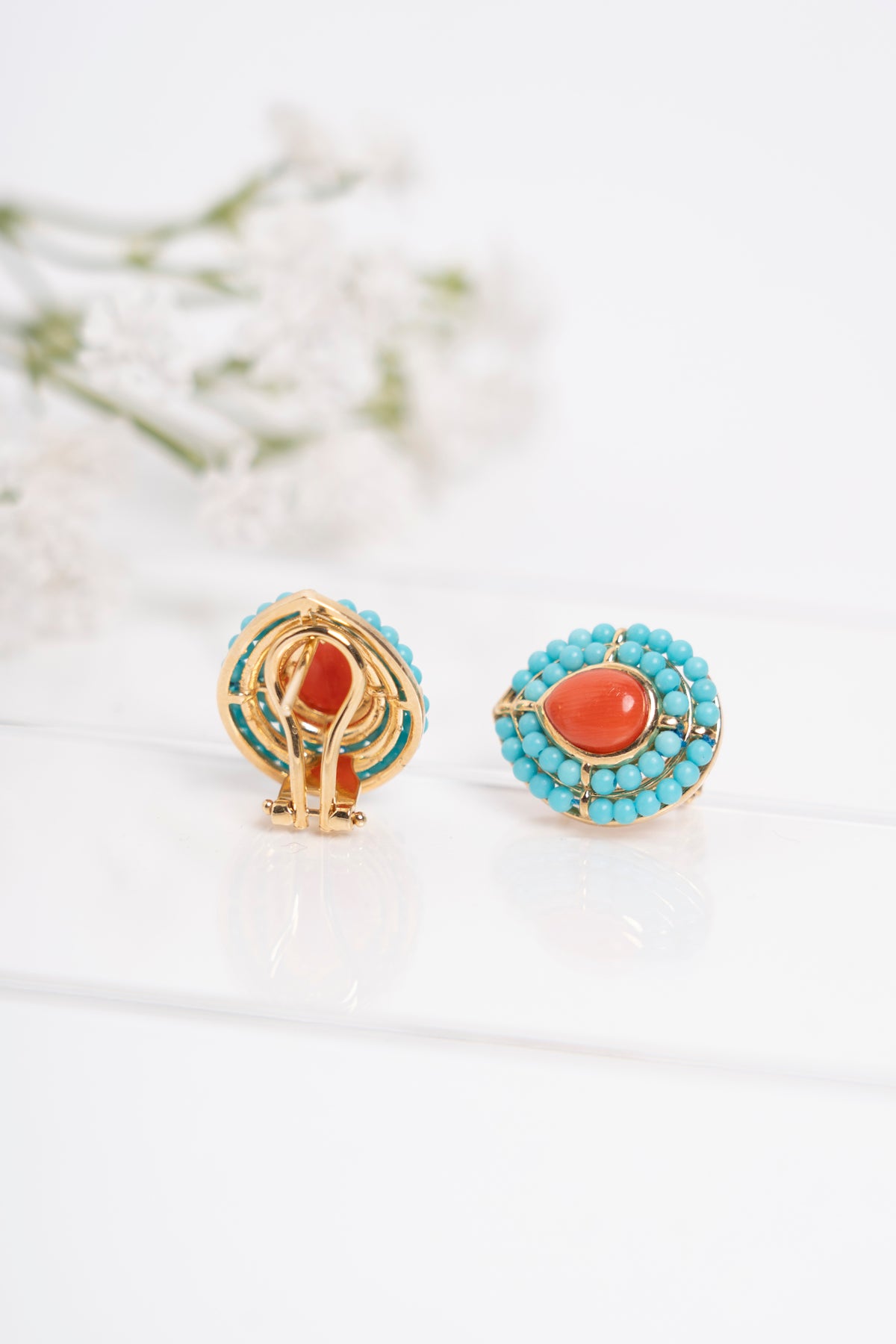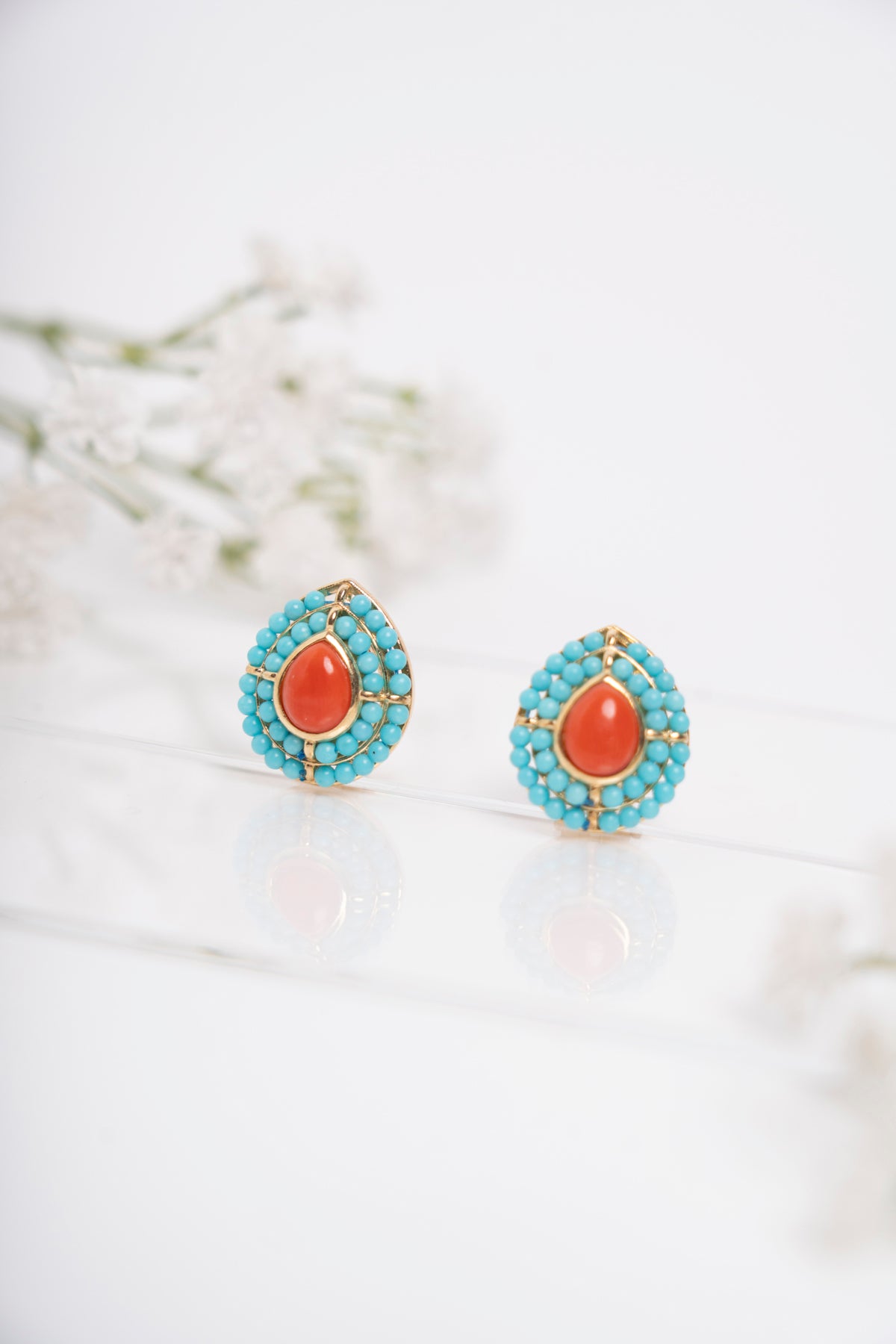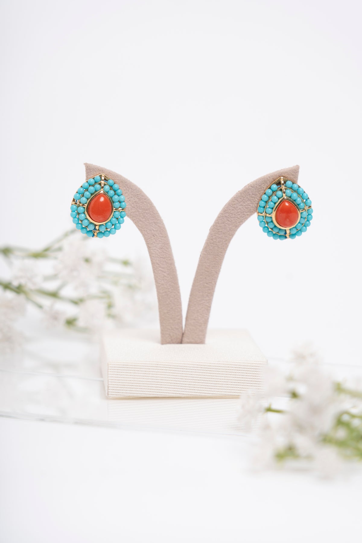 Orecchini a goccia con centrale in corallo mediterraneo e contorno di micro sfere in turchese