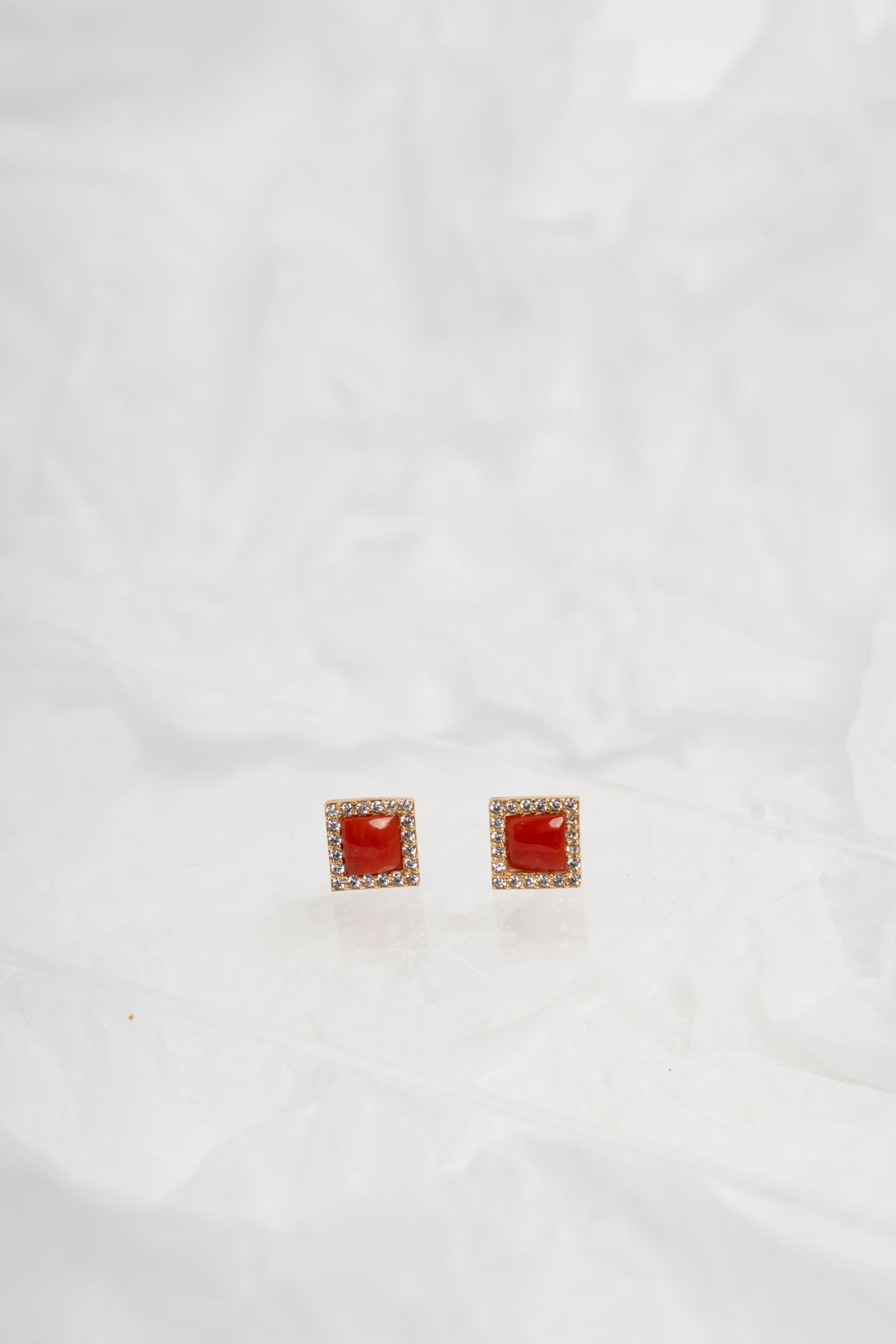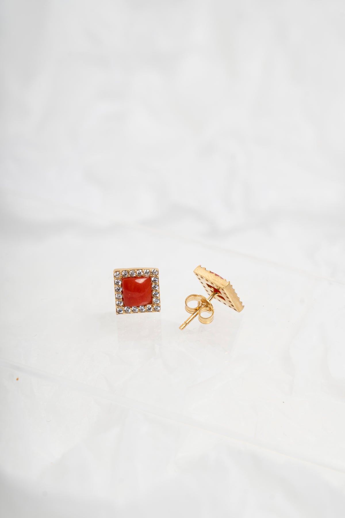 Orecchini in argento placcato oro 18 kt con centrale in corallo mediterraneo cin contorno in zirconi