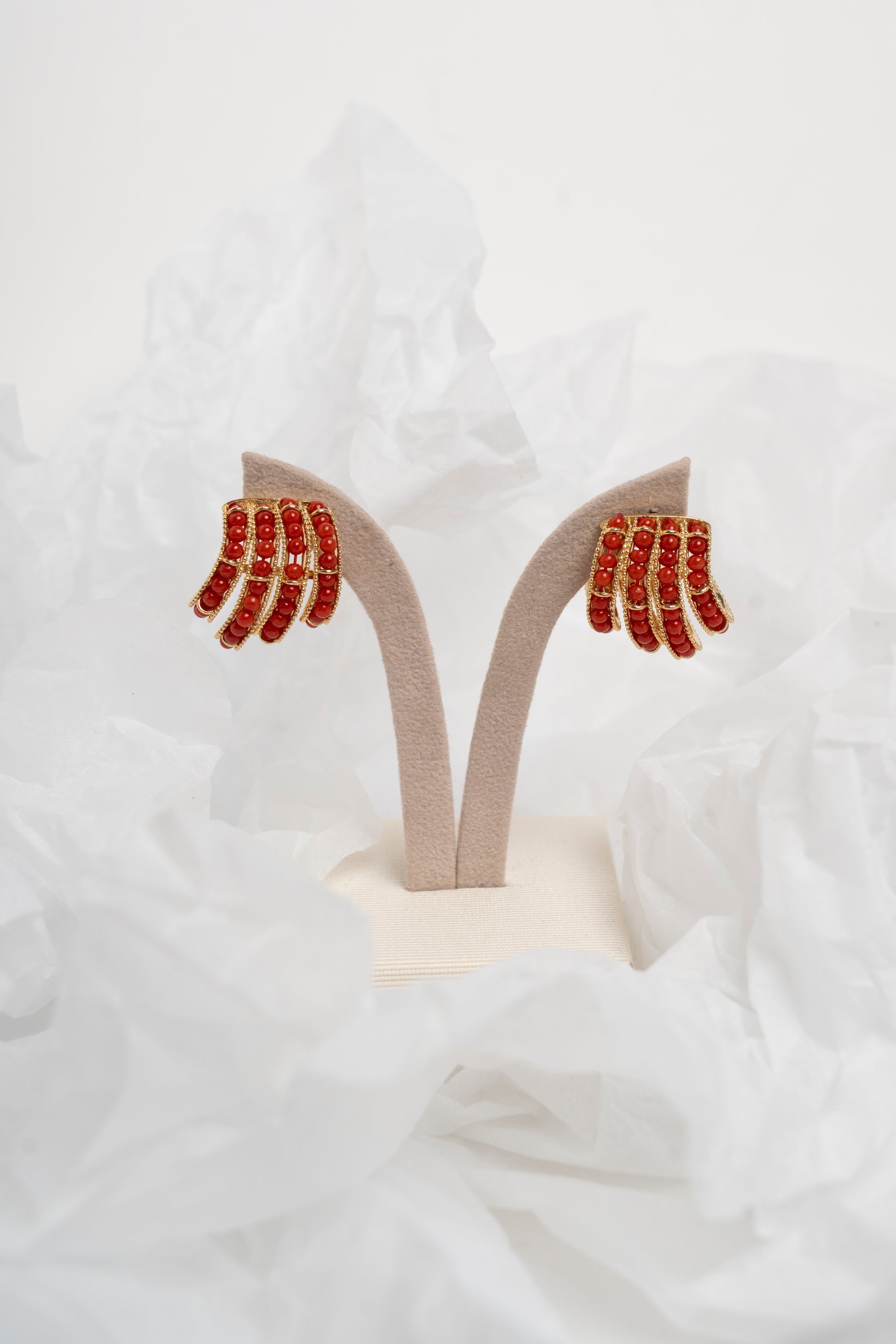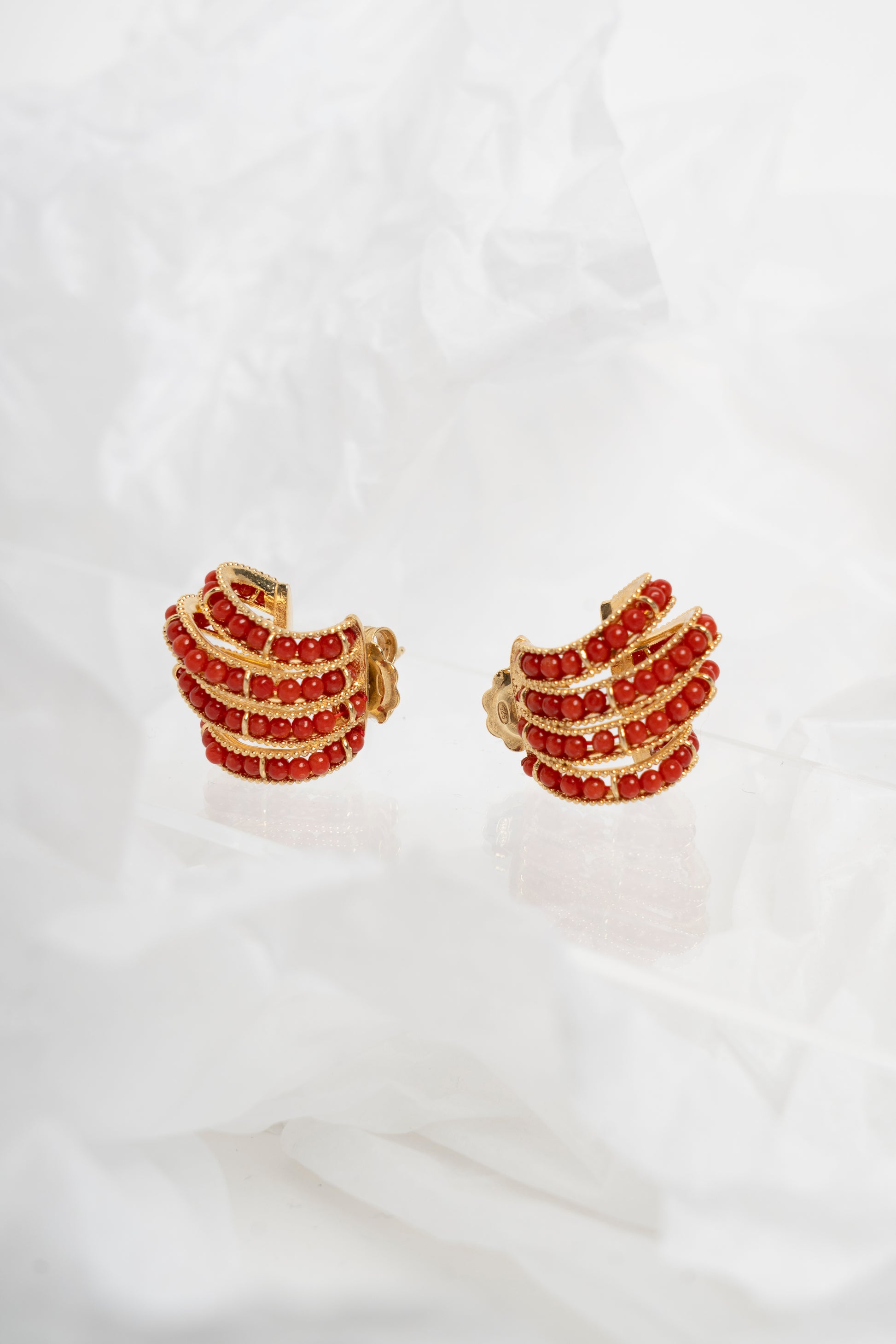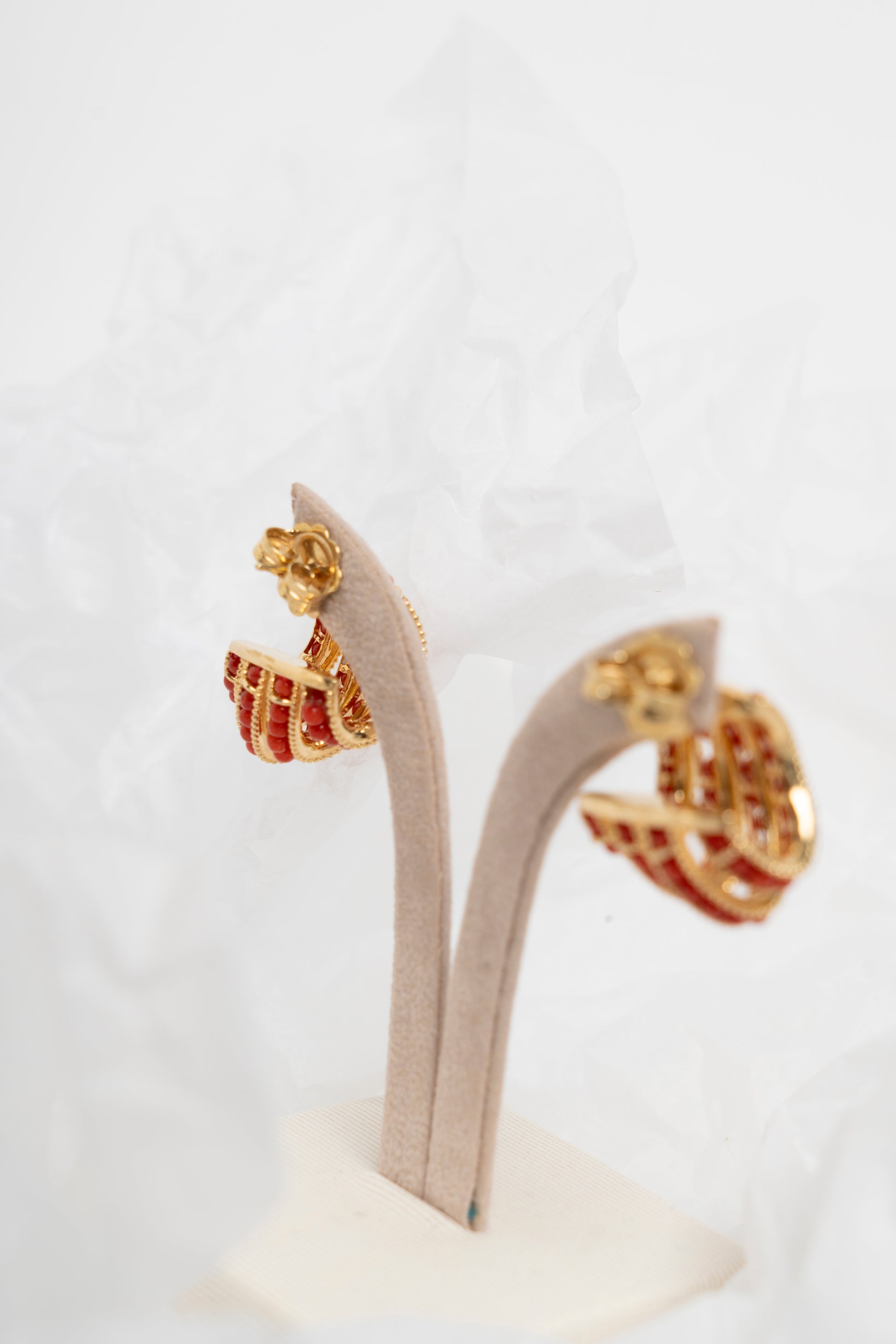 SOARA - ORECCHINI A SALIRE IN ARGENTO DORATO E CORALLO