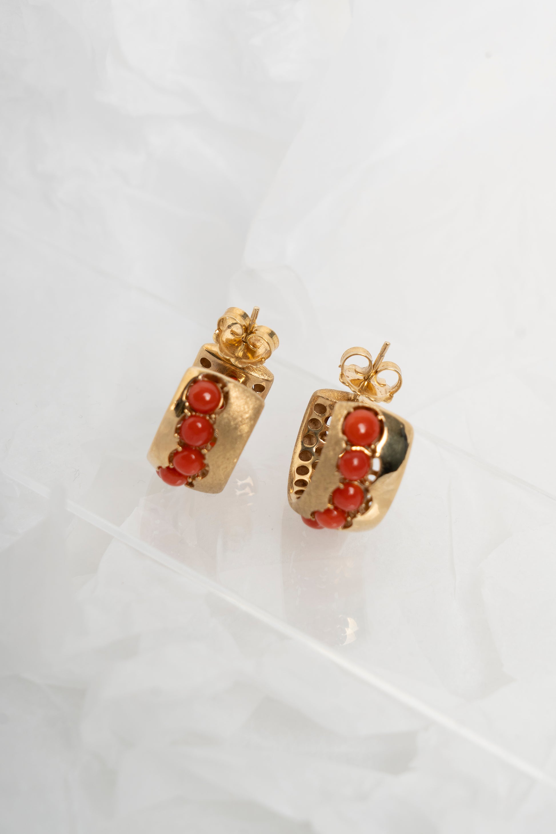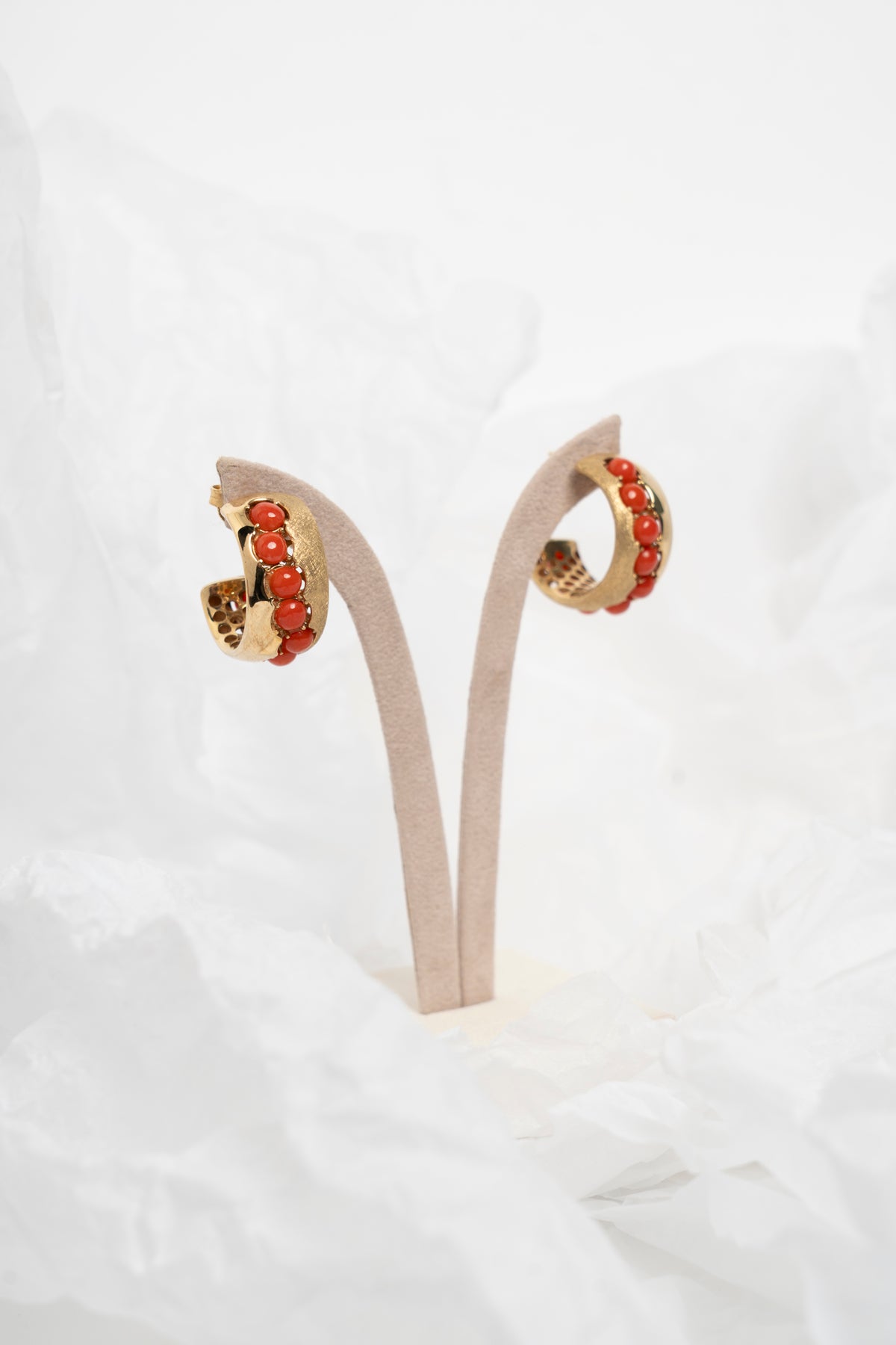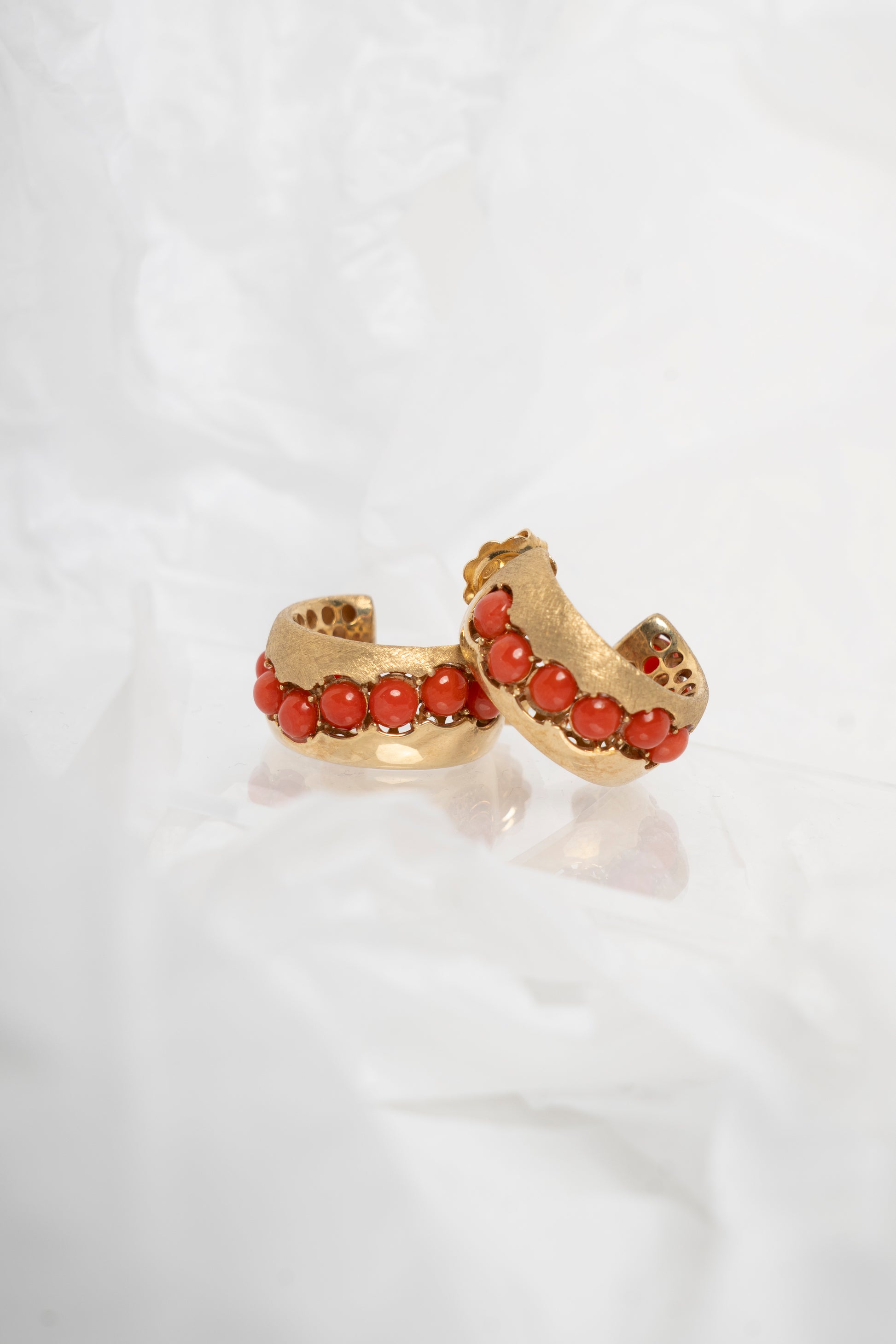 Orecchini a cerchio in argento placcato oro 18 kt opaco e lucido e sfere lisce in corallo mediterraneo