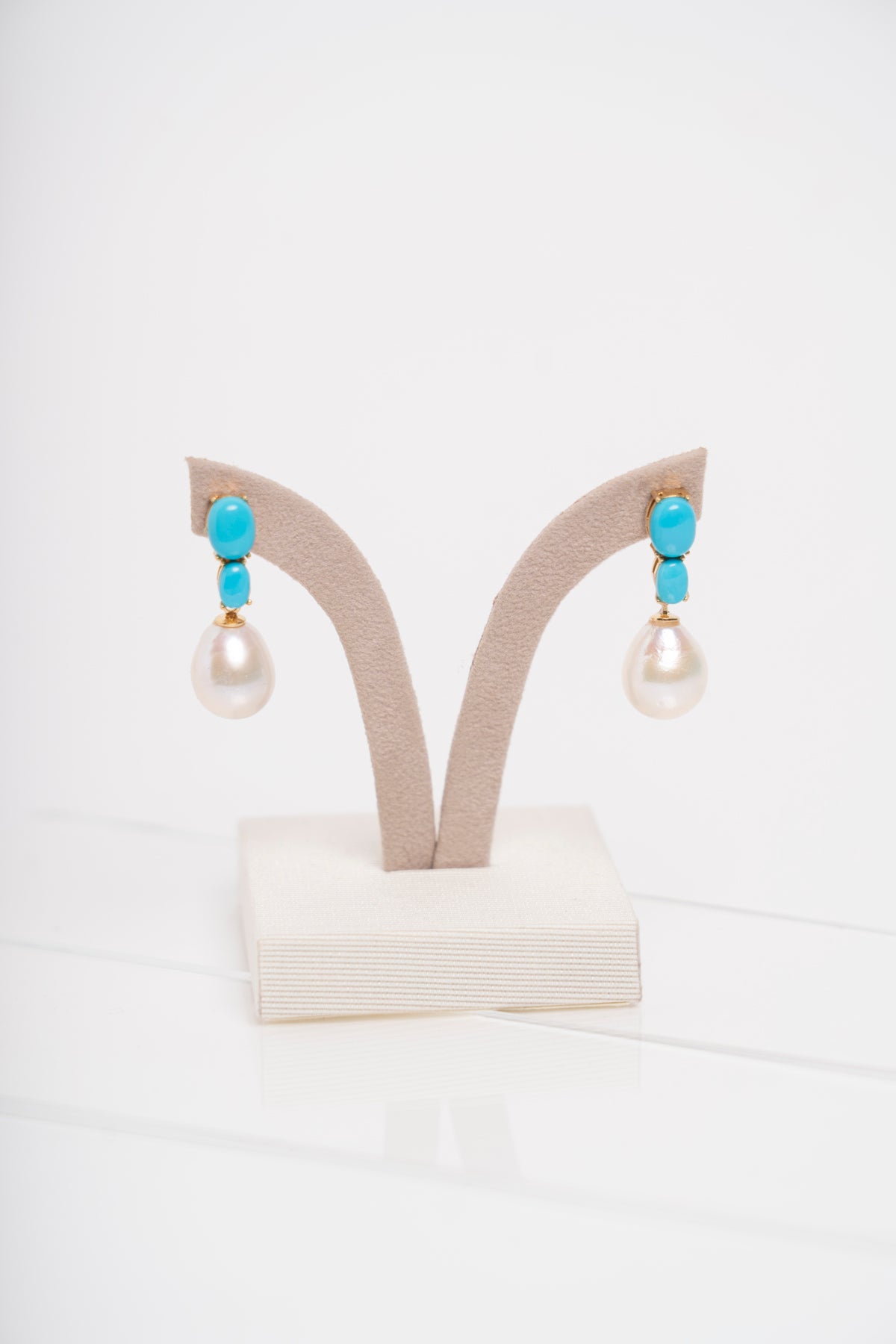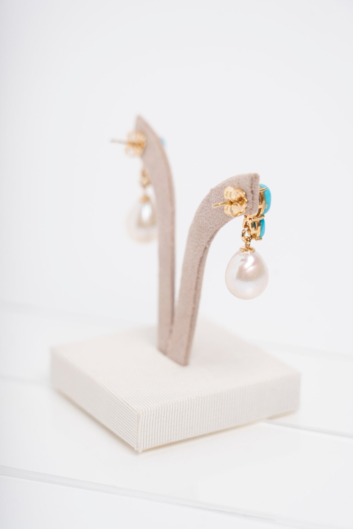 Orecchini pendenti con due sfere in turchese e perla di coltivazione