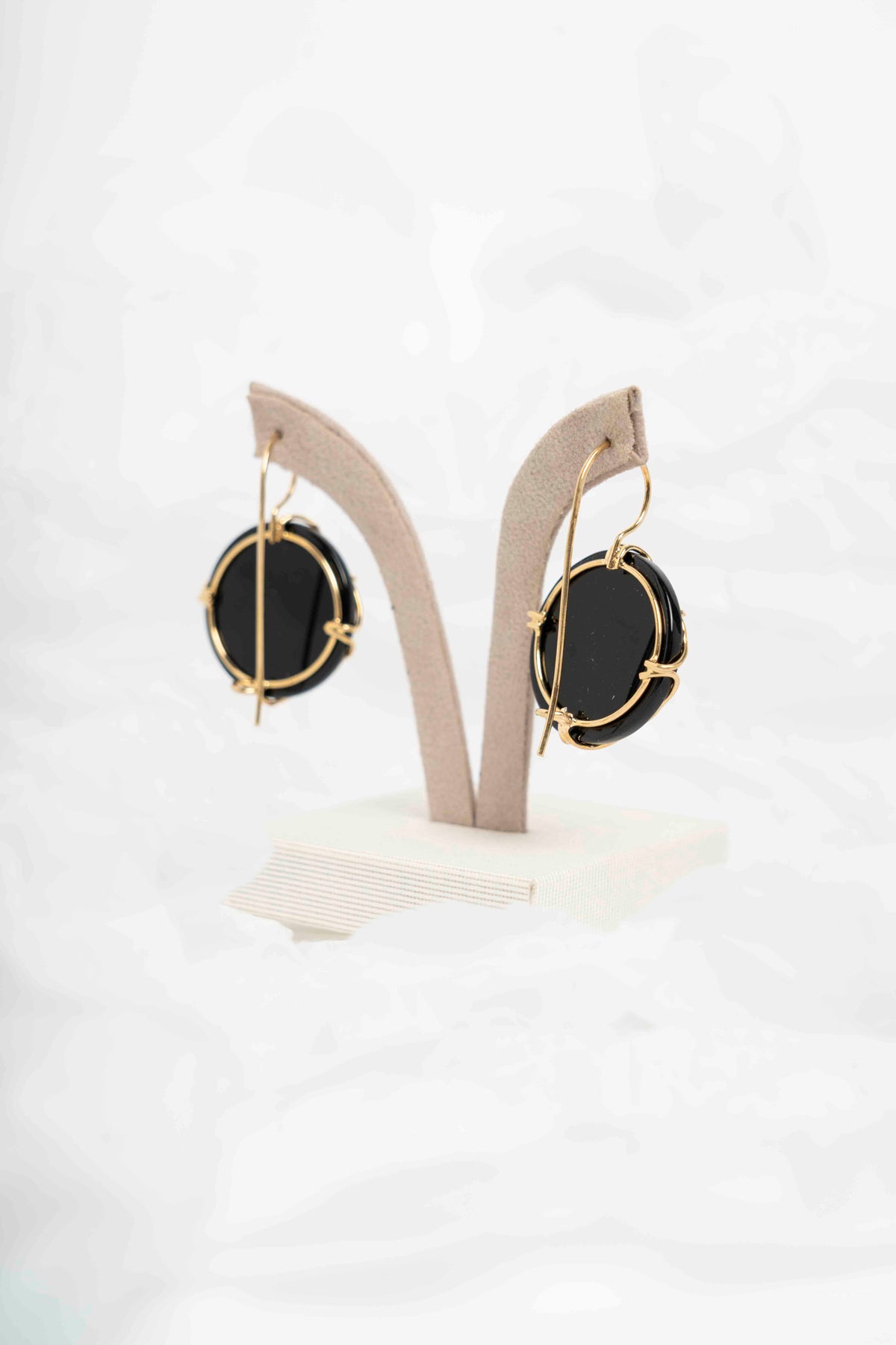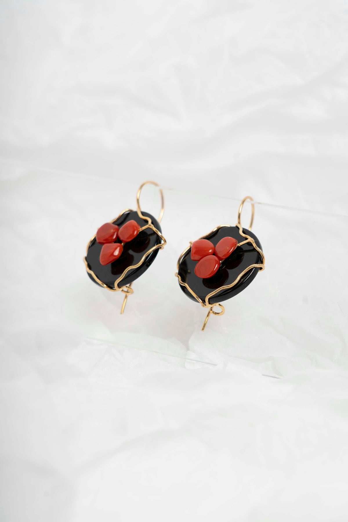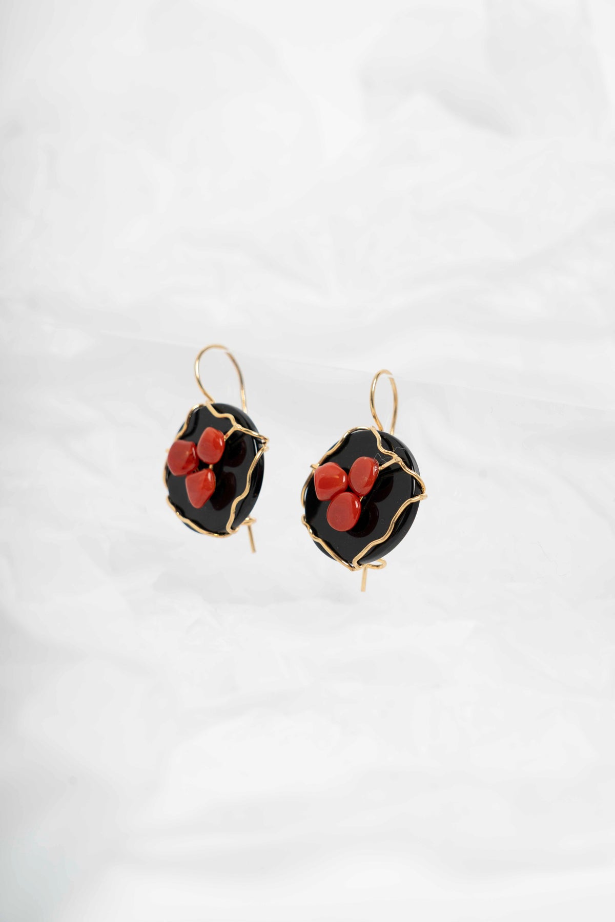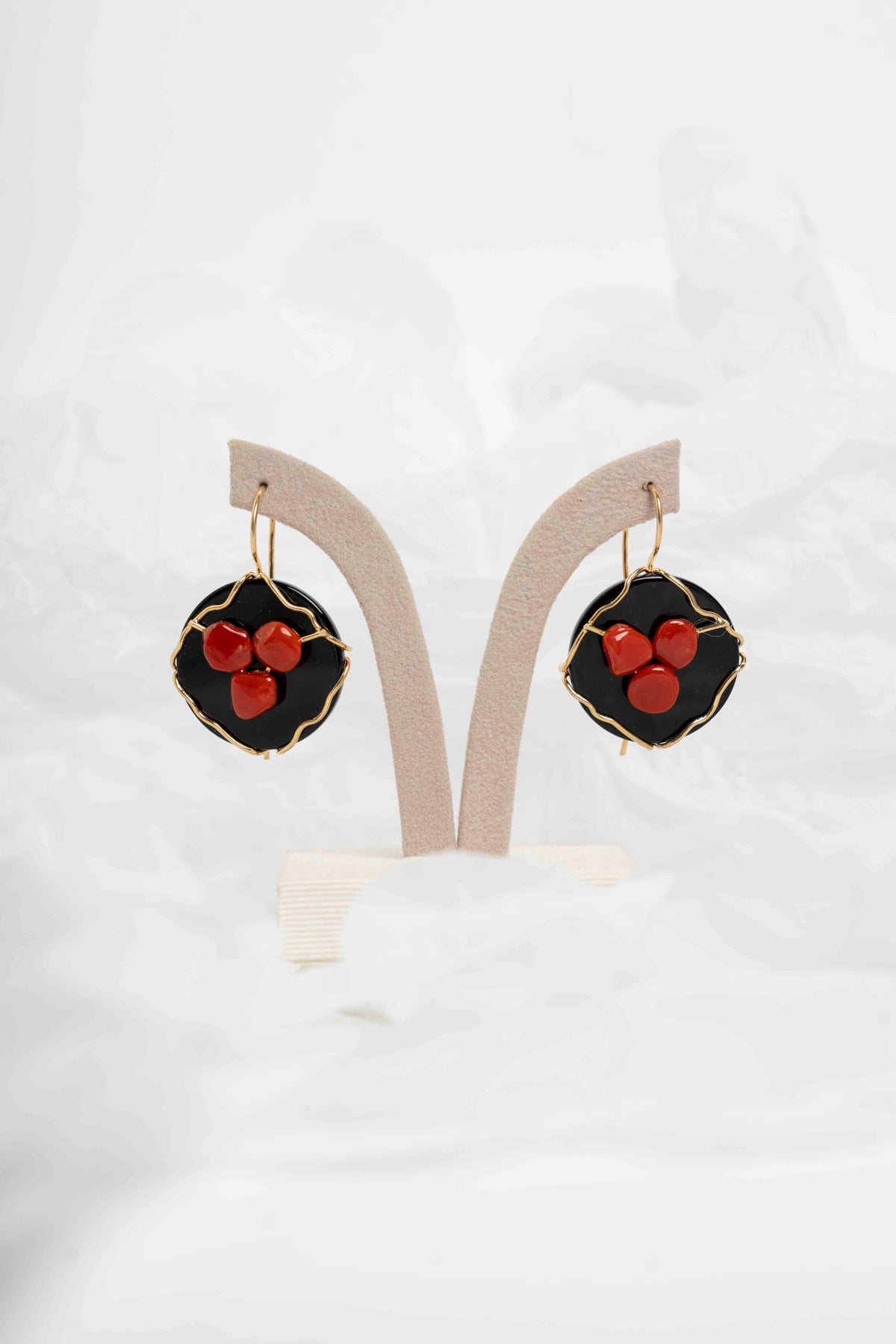 Orecchini pendenti con una disco in onice e corallo mediterraneo.