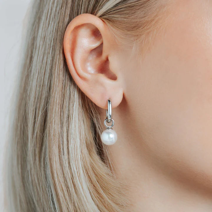 Realizzati in argento sterling 925 e sigillati con una radiosa finitura platino, ogni sottile cerchio sospende una perla bianca perfettamente rotonda che ondeggia delicatamente a ogni movimento.